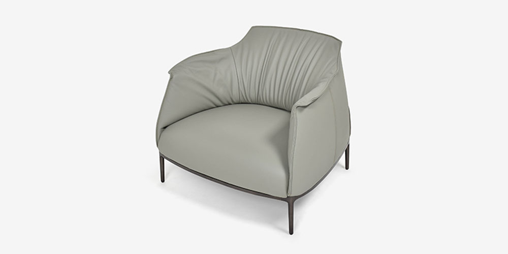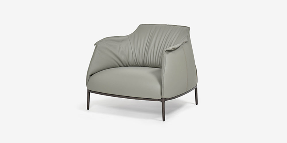 背もたれ全面に張られたレザーが生みだす自然なドレープ感がゆったりとしたデザインによって引き立ち、軽快な動きを出しています。また肘掛けのシャツの襟を開いたようなフォルムも特徴で、手を置いたとき指先に触れる心地よい感触が魅力となっています。