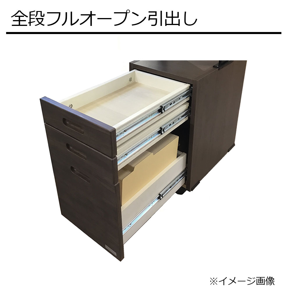 引出しは全段スライドレールを採用。開閉もスムーズでフルオープンになりますので奥の物も取り出しやすくとても便利です。下段はA4ファイルサイズが収納できます。