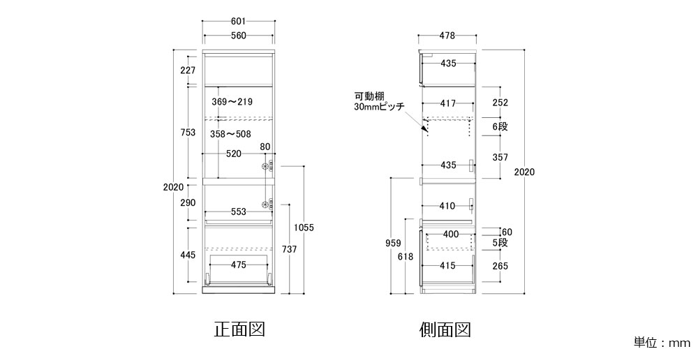 家電やダストボックスなどを効率よく収納できるオープンタイプの家電収納キャビネットです。家電収納スペースの天板裏にはオーブンや炊飯器から出る蒸気を吸収発散するモイスを装備しています。