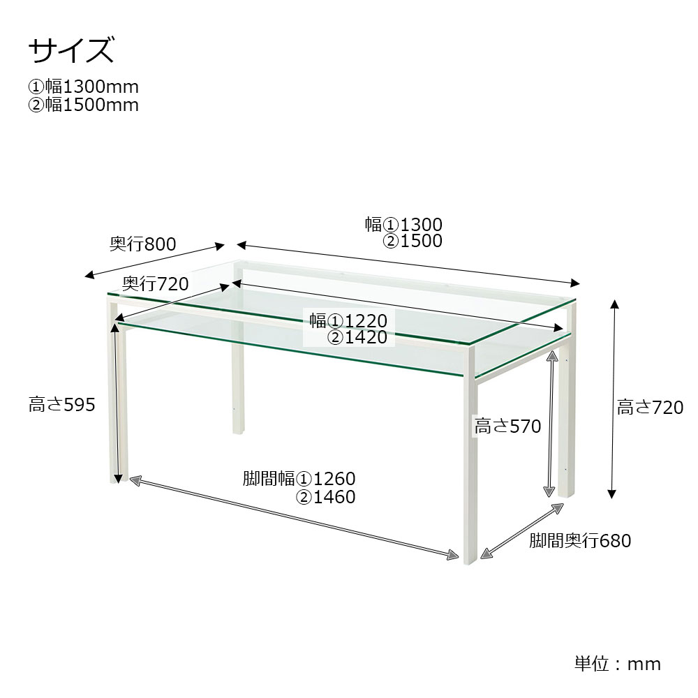 ※画像は幅1300mm 天板:クリアガラス/棚:フロストガラスを使用したイメージです。使用しているダイニングチェアの取扱いはございませんので、予めご了承ください。