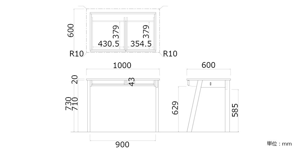 天板は幅100x奥行60cmで、縦にA4が2枚並ぶ奥行です。向って右側の引出しにはB4サイズ、左側の引出しにはA3サイズが収納できます。
