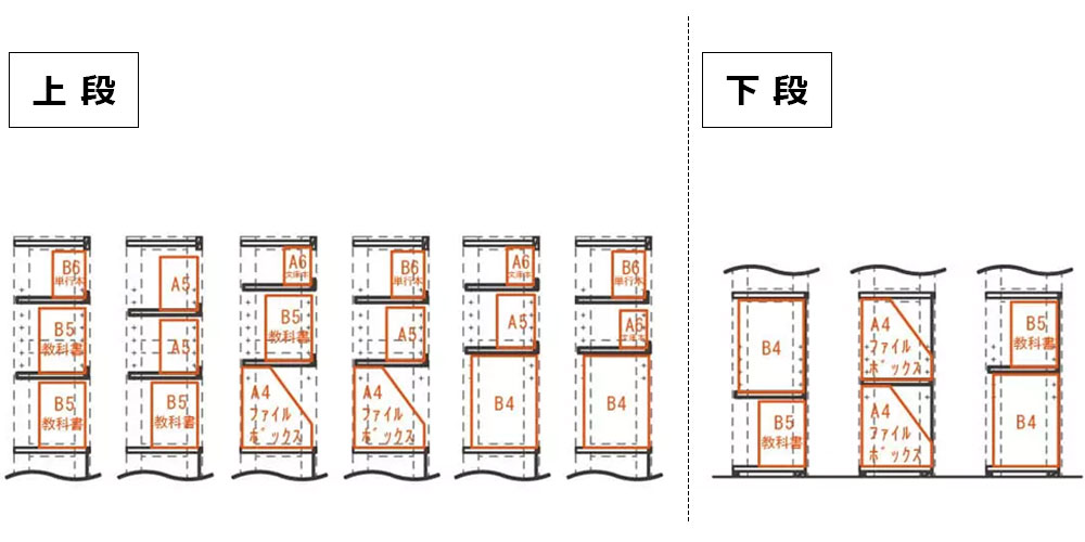 上段・下段ともに高さ調整ができる可動棚はさまざまなサイズの収納物に対応できます。