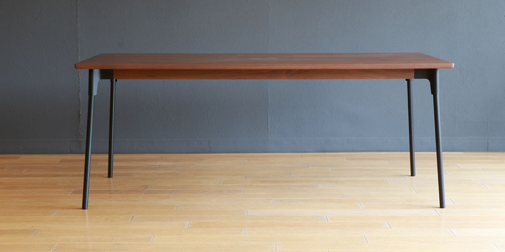 軽快なイメージのスチール脚と優しい印象の無垢材の天板を組み合わせた北欧調のデザインです。天板には最高ランクのウォールナット材を使用しており、きめ細かな木目は重厚感と美しさを兼ね備えています。スチール脚はインテリアに合わせて4色からお選びいただけます。※画像は脚部ブラックです。