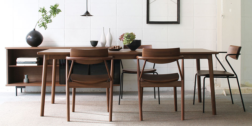 空間と人々の生活の間に寄り添う家具。dual/デュアルは構造となるスチールフレームと機能を受け止める木部のコンビネーションシリーズです。※画像のダイニングテーブルは木脚タイプです。恐れ入りますが、画像の木製チェアは既に製造を終了しております。