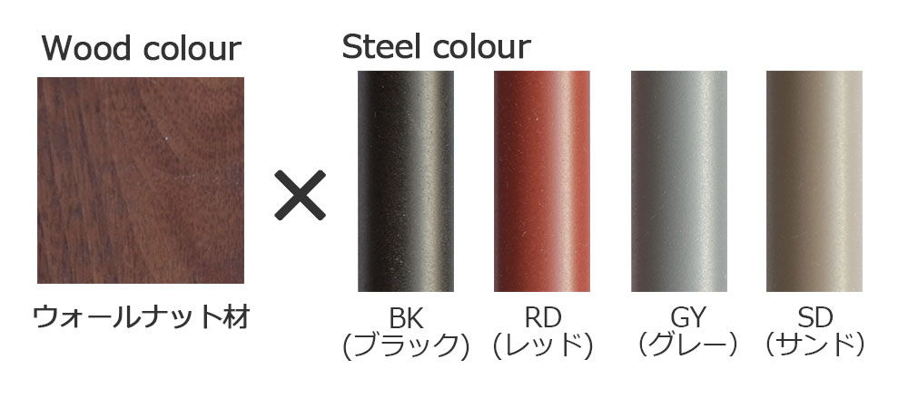 スチール部分は落ち着いたカラーの4色(ブラック・レッド・グレー・サンド)からお選びいただけます。