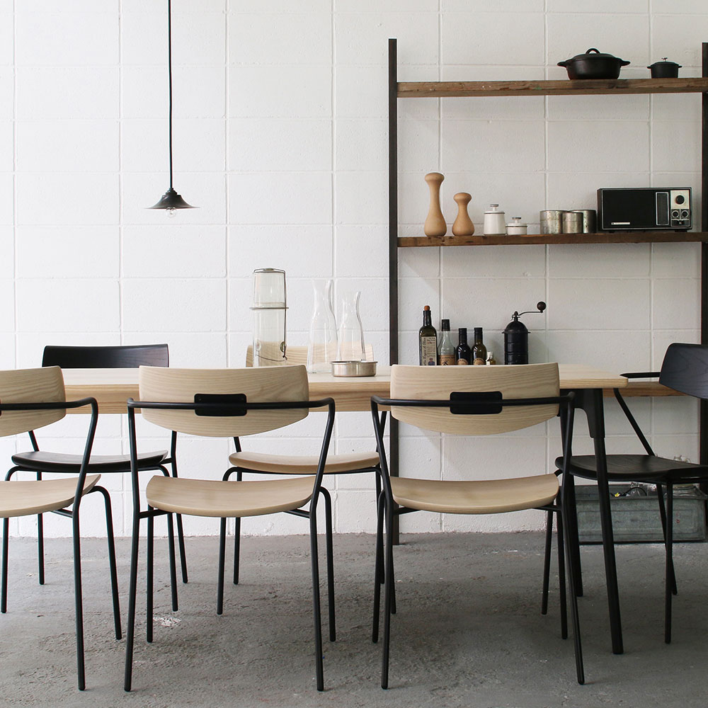 軽快なイメージのスチール脚と優しい印象の無垢材の天板を組み合わせた北欧調のデザインです。天板には明るい色と鮮やかな木目が特徴のホワイトアッシュを使用しており、ダイニングを明るく彩ります。スチール脚はインテリアに合わせて4色からお選びいただけます。※画像は脚部ブラックです。