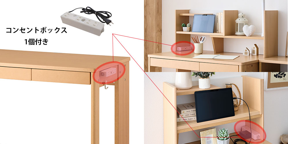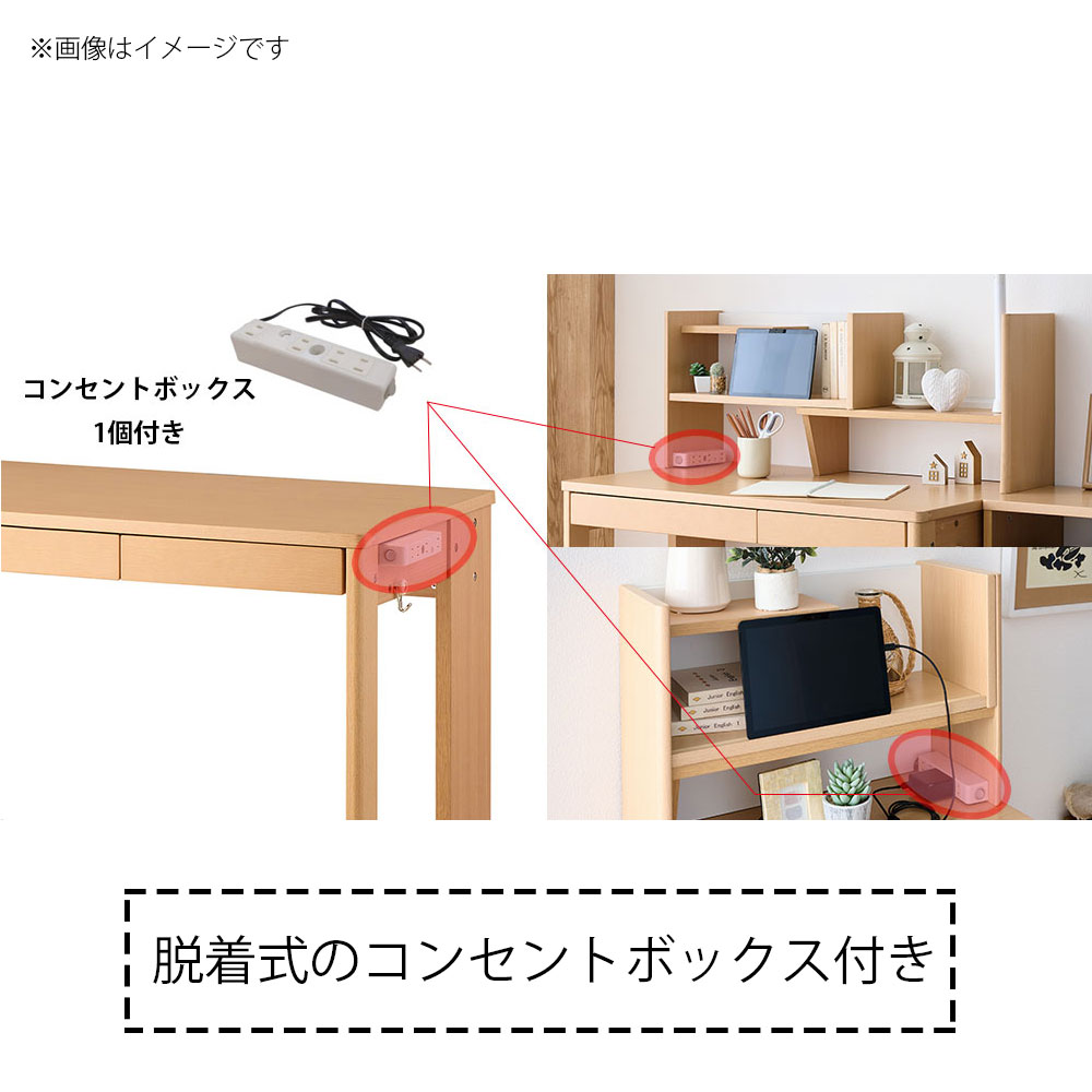 付属しているコンセントボックスは脱着式です。デスク側面の両サイド・マルチラック上台の内面両サイド ( 計4か所 ) に取り付けることができます。