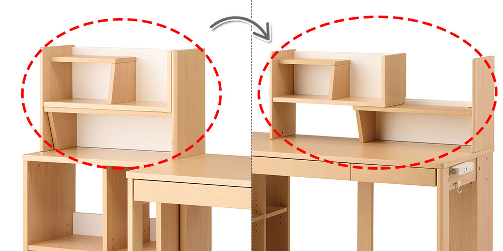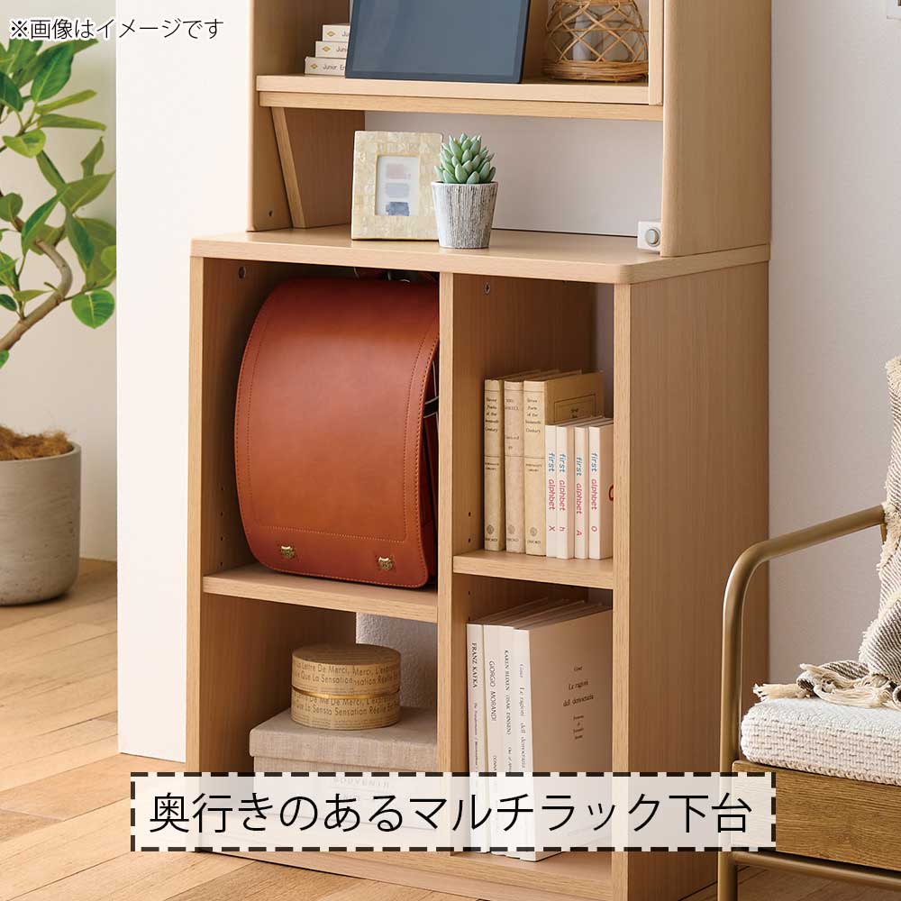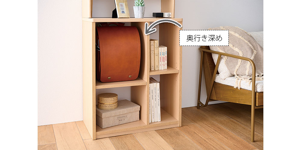 マルチラック下台は、ランドセルをすっぽり収納できるように奥行きが深めになっています。棚板の高さ調整3cmピッチで5段階調節できます。
