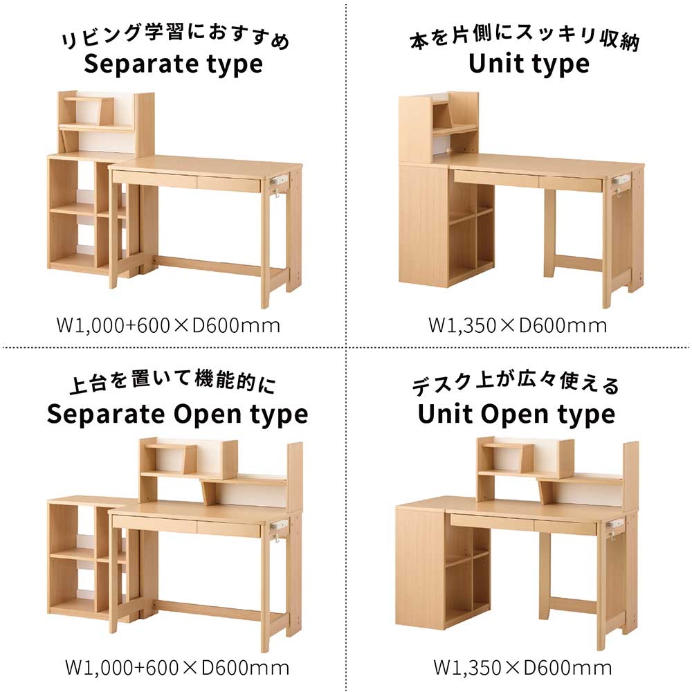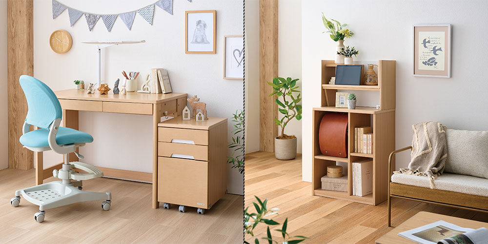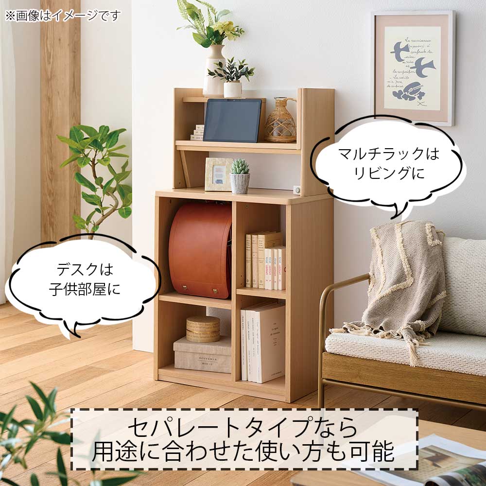 セパレートタイプは、リビング学習の際、マルチラックだけをリビングに置いていただいたり、デスクを子供部屋に置いておけば子供部屋にも学習できるスペースが確保できるので、リビング学習から子供部屋への移行もしやすくなります。
