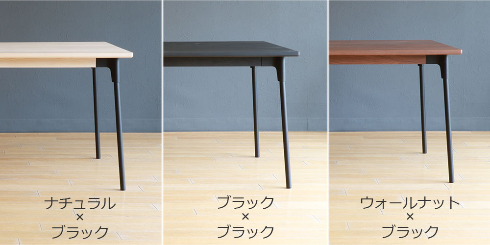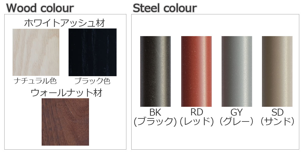 木部はホワイトアッシュ材ナチュラル色・ブラック色・ウォールナット材の3色から、スチール部分は落ち着いたカラーの4色(ブラック・レッド・グレー・サンド)からお選びいただけます。