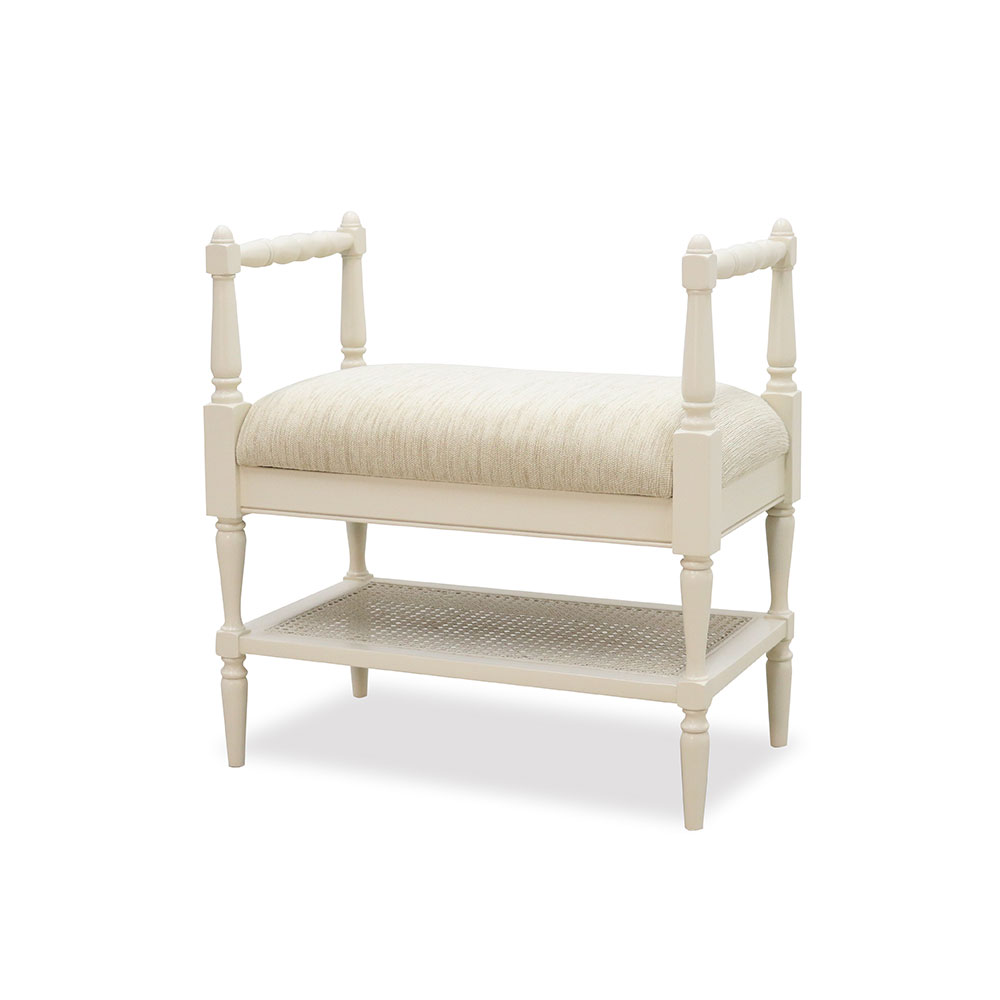 ゆるやかにカーブした柔らかなフェイスラインやカブリオールレッグと装飾。上品な雰囲気と可愛らしさを際立たせているフレンチクラシックデザインシリーズのベンチスツールです。玄関用のスツールとしてもぴったりです。両側には立ち上がり補助アームが付いています。棚板はラタン張りでスリッパなどの小物収納に便利です。