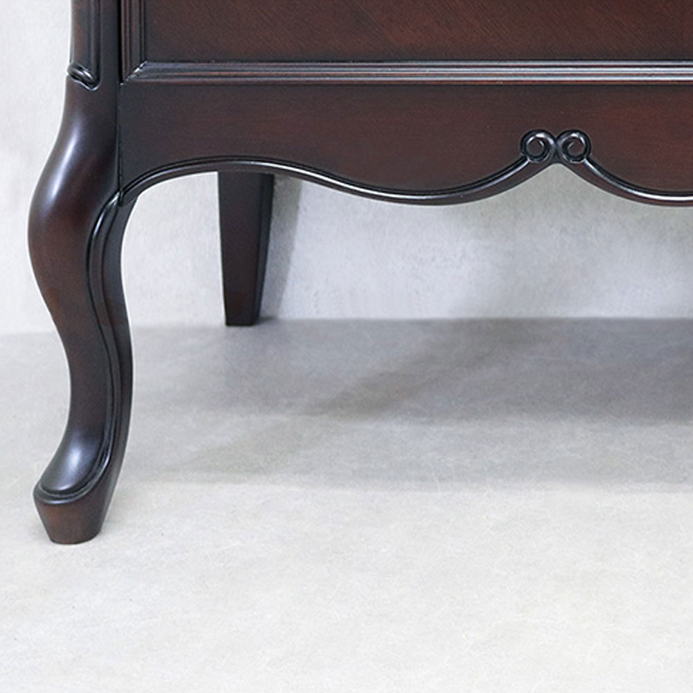 表面は厳選されたマホガニー材を使った突板を施し、フレンチエレガンスの代名詞といえる「カブリオールレッグ(猫脚)」と、なめらかな女性的な美しいラインとマホガニー無垢材を削り出した彫刻が特徴です。 ゆるやかにカーブした柔らかなラインとカブリオールレッグと彫刻が上品な雰囲気と可愛らしさを際立たせています。