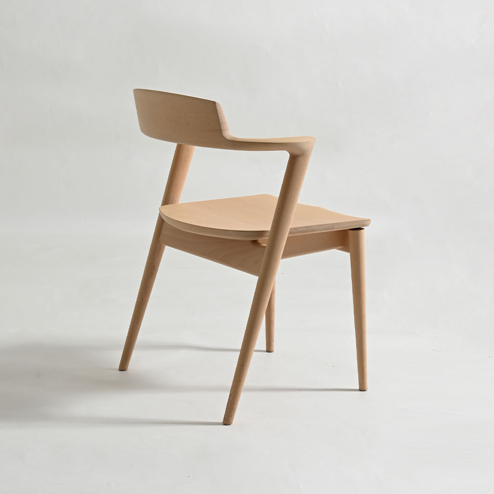 一般的なアームチェアに比べ肘部分が短いセミアームは、出入りする動作を妨げず、ゆったりと開かれた肘の広がりで自然に座る動作へと導きます。立上りや座って読書などをする時はしっかりと支えになります。