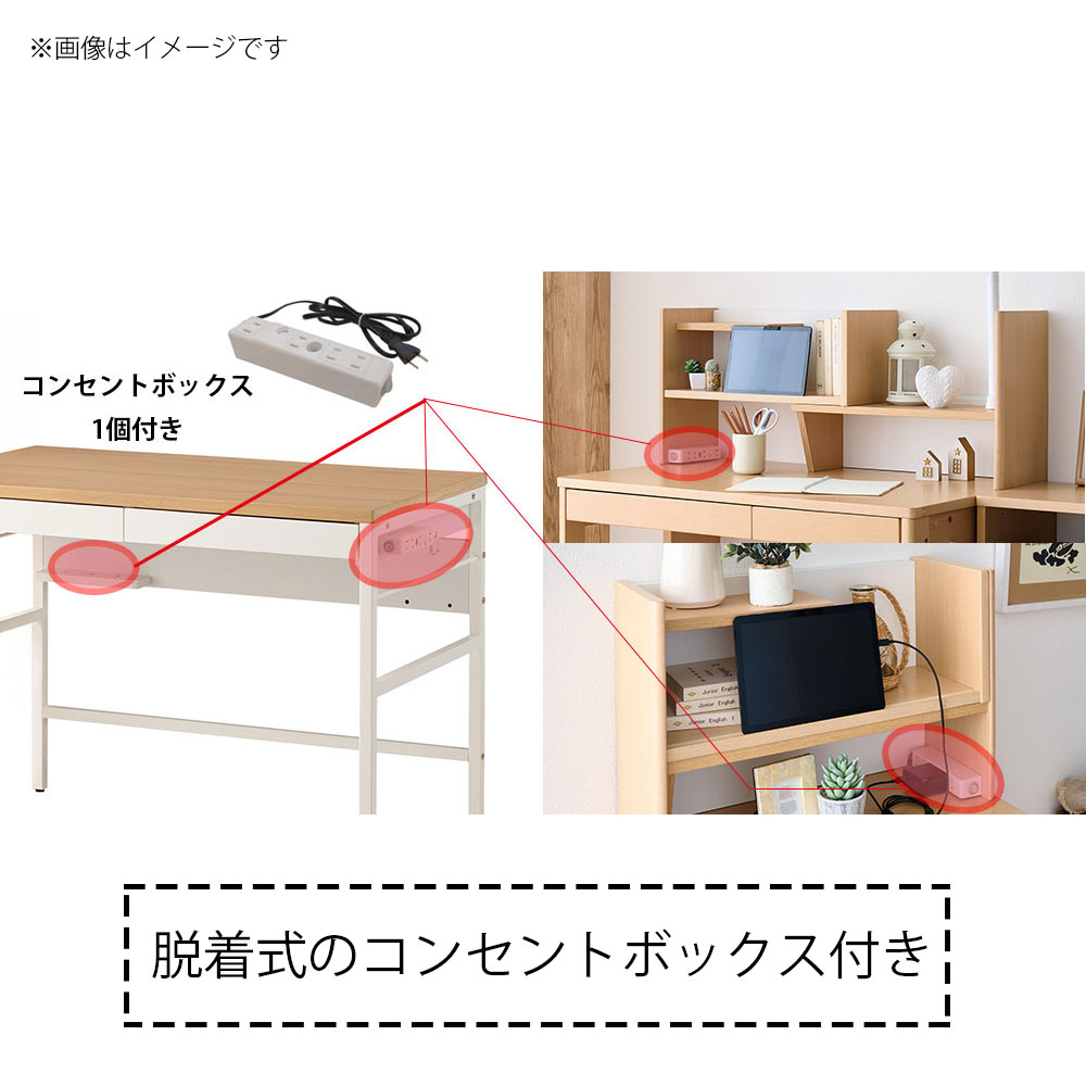 デスクの背板下は、コード棚付きで、コードやコンセントボックスを置くことができます。