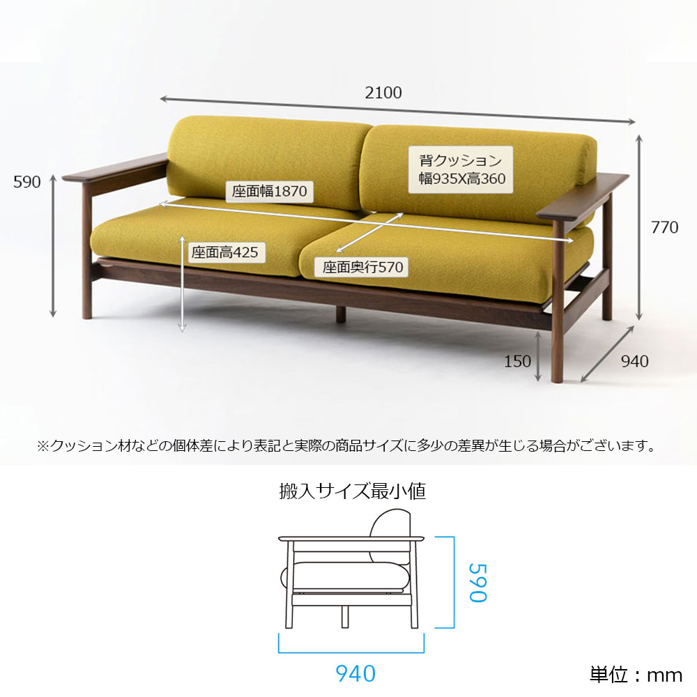 飛騨産業 ソファ 3人掛け「SATSUKI -サツキ- FP105SOU」 幅210cm ウォールナット材 WA色 布#EミモザYE【受注生産品】