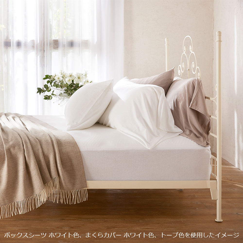 ボックスシーツ「Nプリート」ホワイト色、まくらカバー「Nプリート」ホワイト色、トープ色を使用したイメージ画像です。まくらカバー以外は別売りです。