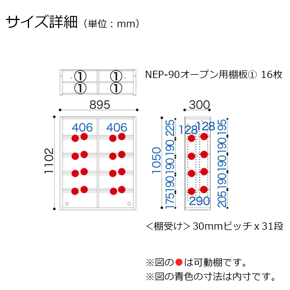 NEP-90 オープンAは奥行128mmの棚板が付いたタイプです。前後に並べて置けばフラットな奥行256mmの棚に変化します。ひな壇のようにずらしておけば奥行のない物を見せるように収納できます。