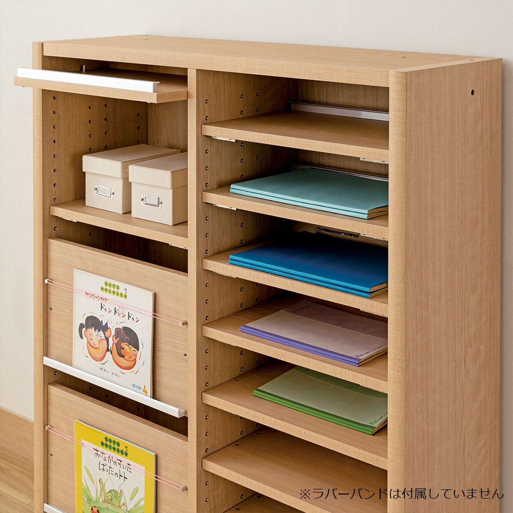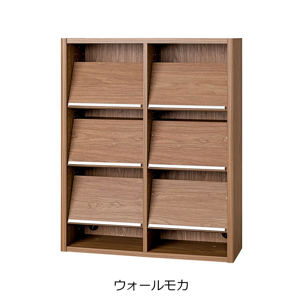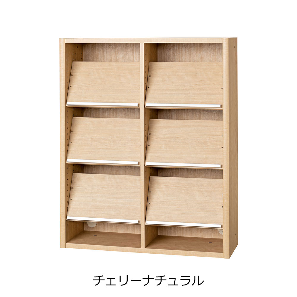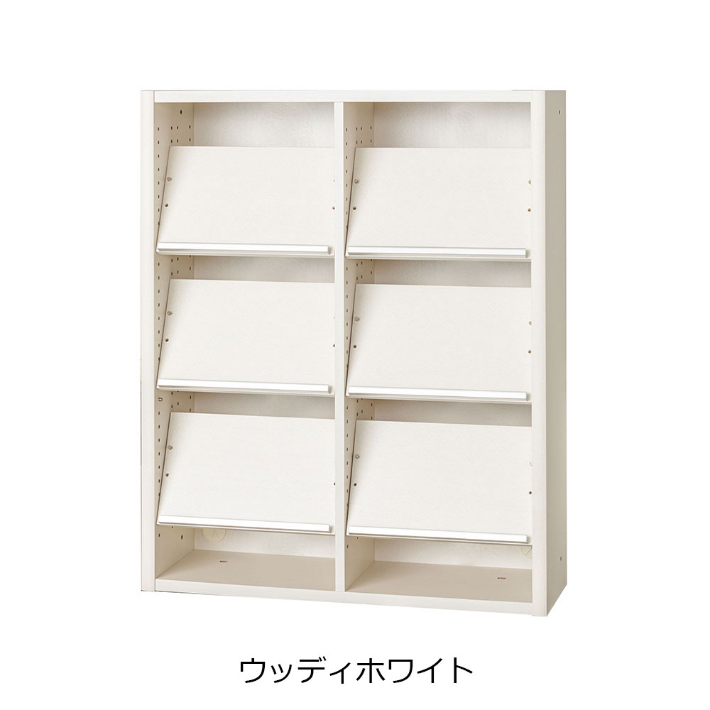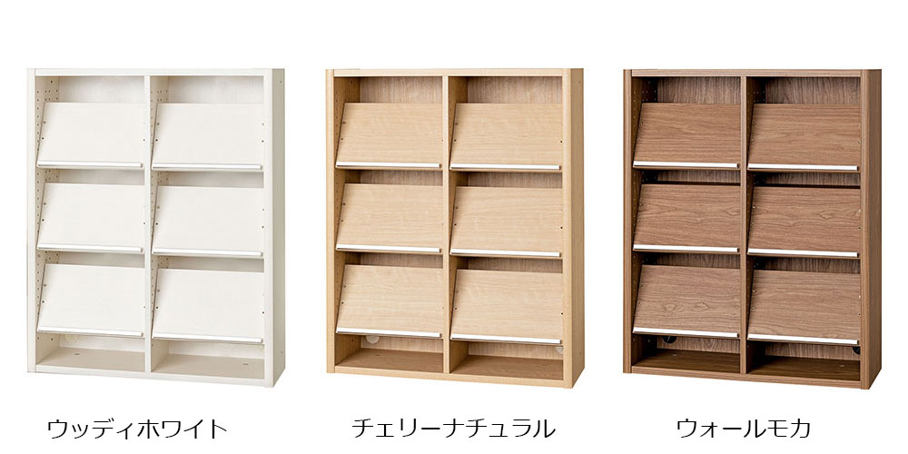 ディスプレイ棚板の枚数が多いタイプです。ディスプレイ棚板を垂直に取り付けると、後ろにA4収納が可能です。棚板を水平にして細かく設置すれば、薄い紙や雑誌をきれいに収納できます。