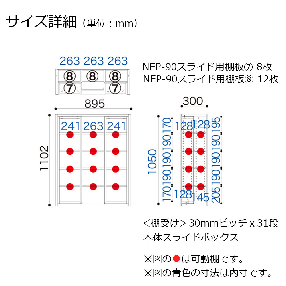 NEP-90 スライドFは前面にスライドボックスが付いたタイプです。文庫や新書本などをたくさん収納できます。ボックスを動かせば、奥の物も楽に取り出せます。