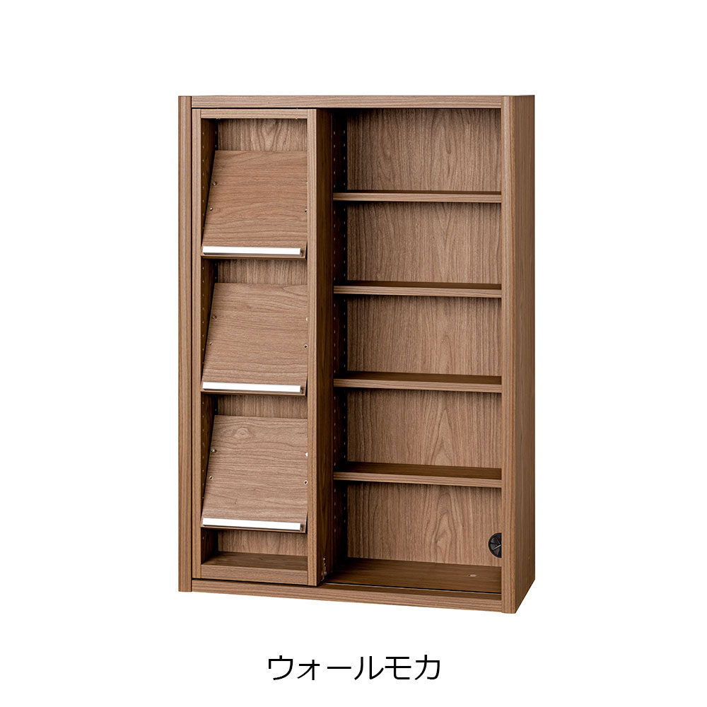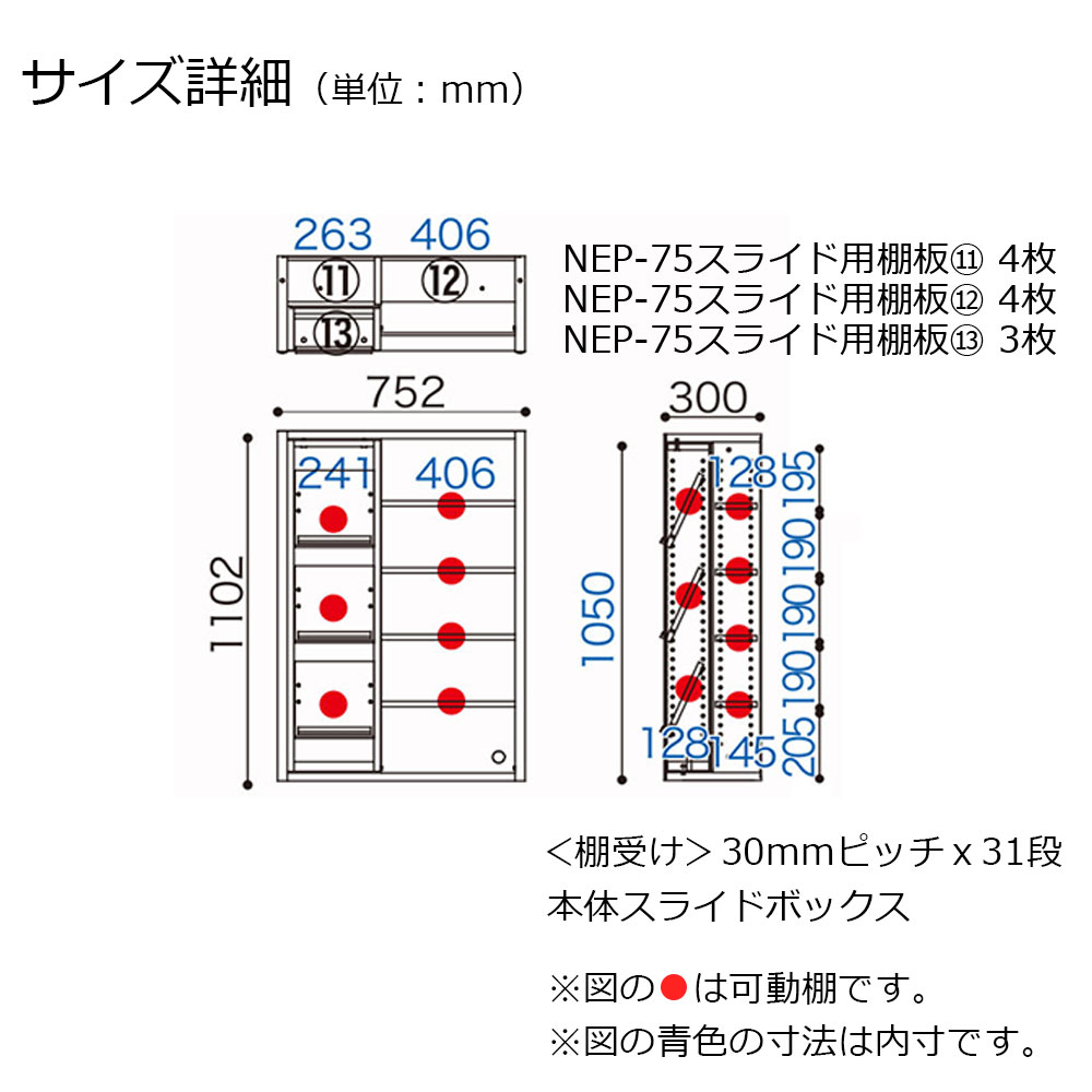 NEP-75 スライドGはスライドボックスにディスプレイ棚が付いたタイプです。ボックス裏には文庫や新書本などをたくさん収納できる、奥行128mmの棚板が付いています。収納力と見せる収納を兼ね備えています。