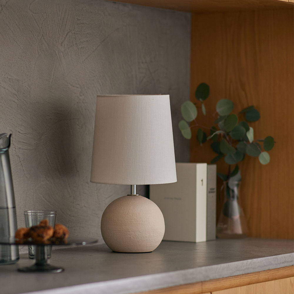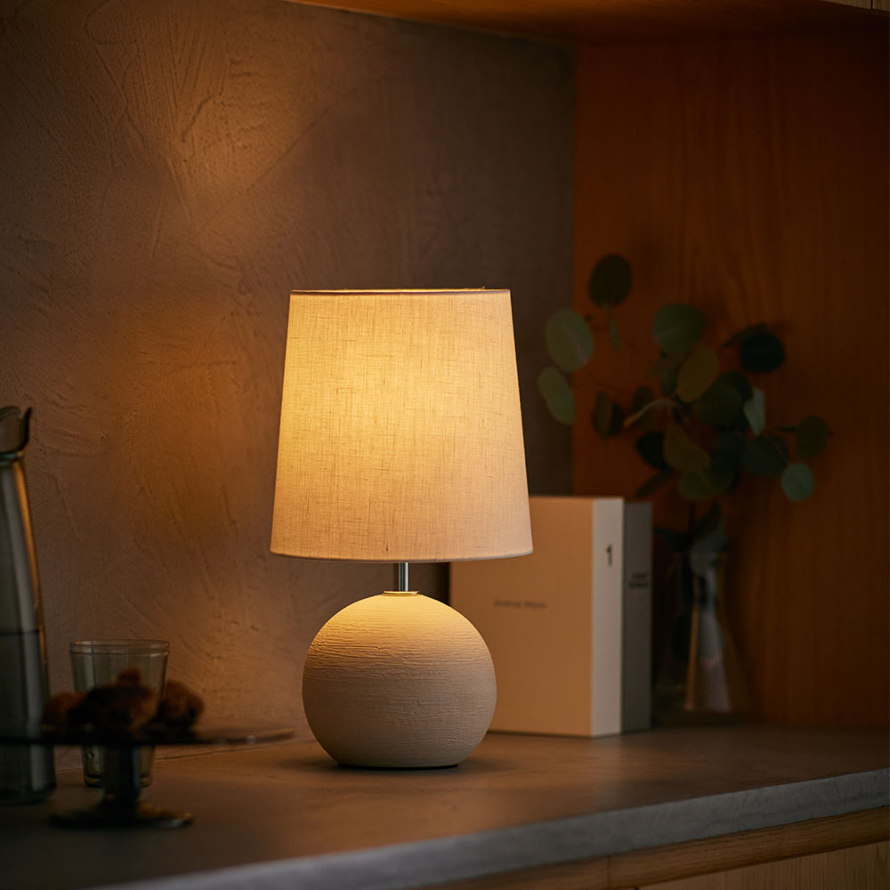 天然素材リネン100%のスラブ生地のセードに、日本六古窯のひとつでもある信楽焼で生産した陶器を合わせたテーブルランプ。