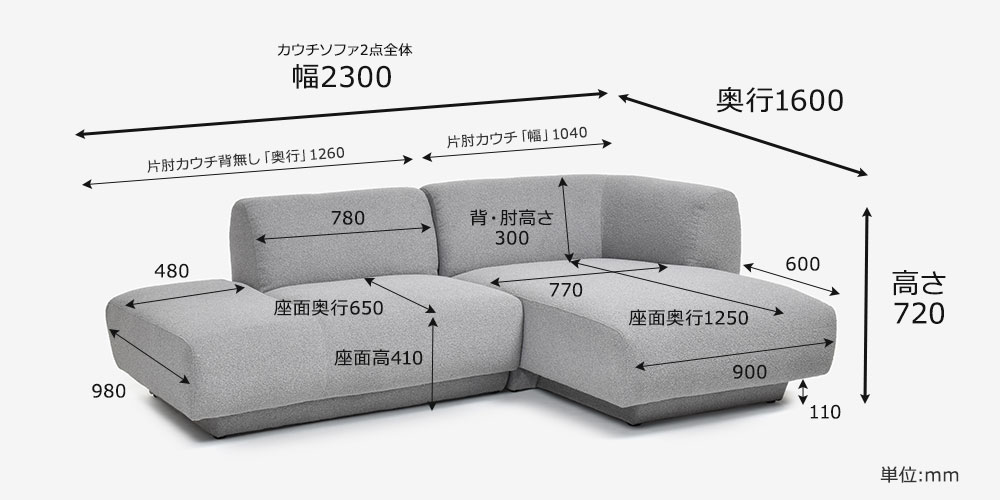 | ・片肘カウチ(向かって右肘) | 幅1040x奥行1600x高さ720 |