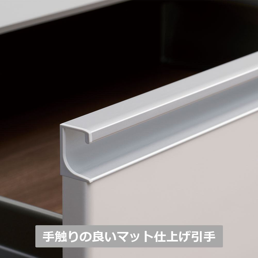 ドイツ、ヘティヒ社のイノテックレールを使用。フルスライド引出しで奥の物まで見渡せます。ソフトクローズ仕様で優しく閉まります。引手は手触りが心地よいマット仕上げです。(床板:グレイッシュナット色)