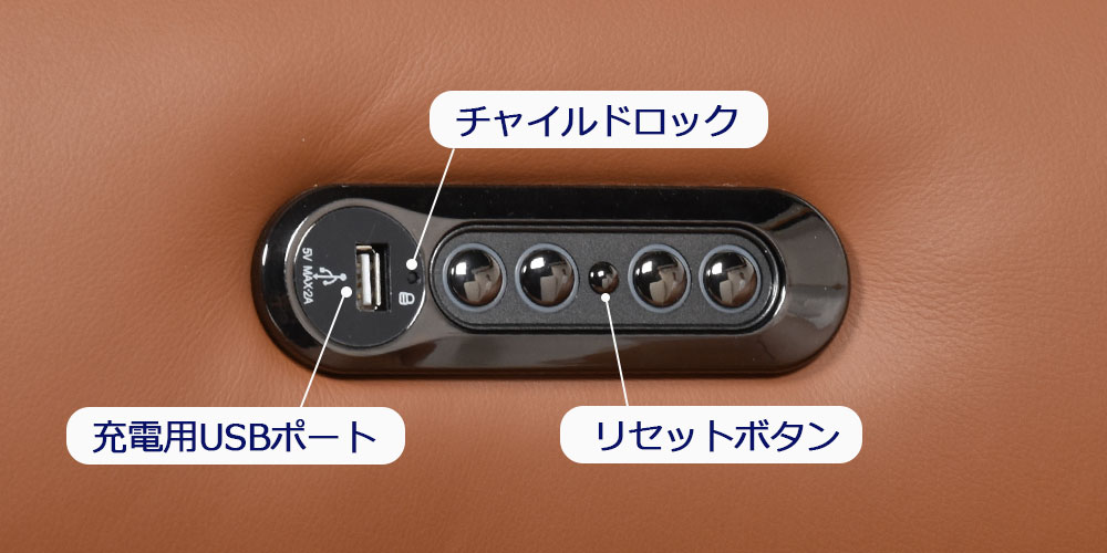 その他チャイルドロックやヘッドレスト・フットレストが一括で元に戻るリセットボタンと便利な機能付きです。