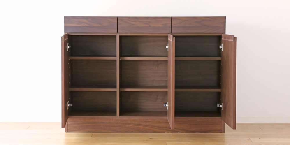 上部には細かな物の収納に便利な3杯の引出し。内部には可動棚が6枚あり、収納するものに合わせて棚の間隔を調節可能です。開き扉はダンパー付き丁番を使用しており、ゆっくりと閉まります。