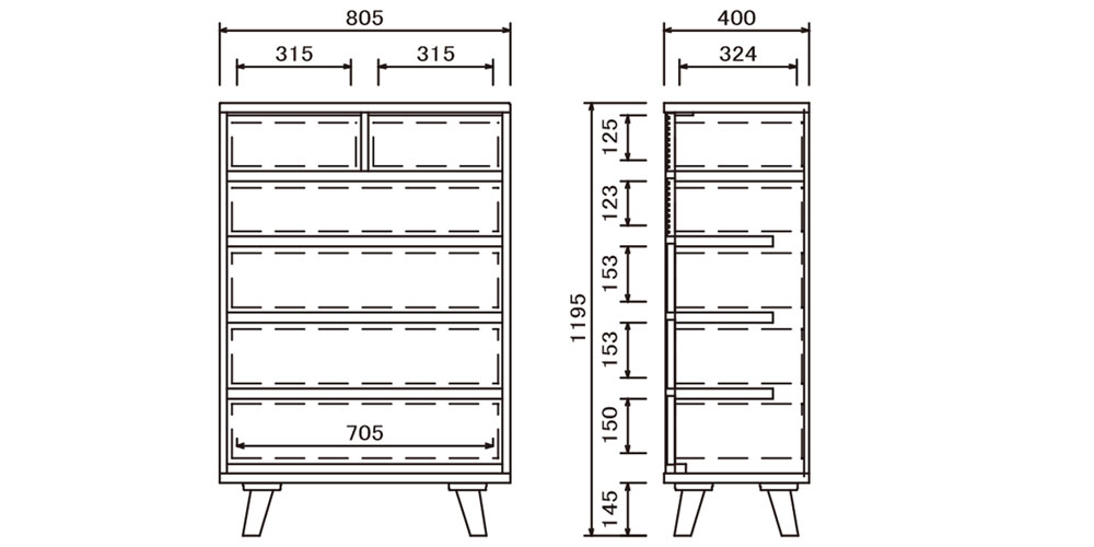 奥まで見渡せるフルオープンの引出しが6杯ついており、たっぷりと収納できます。引出しは9mmの桐無垢を使用した箱組仕様で湿気から衣類などを守ります。床板は桐無垢ではなくシート張りです。※画像はクラークシリーズの引出しイメージです。ハイチェスト80の最上段は引出し2杯に分かれています。本ページ掲載品とは異なります。