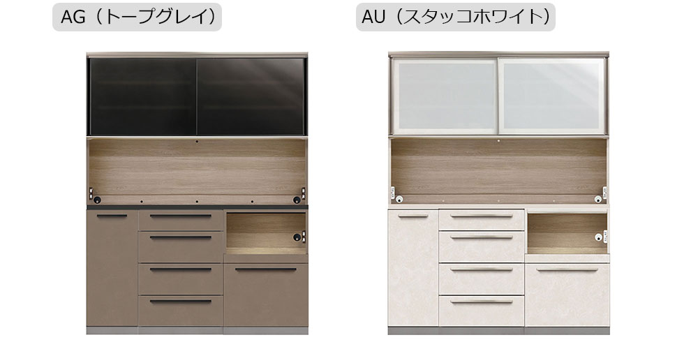 家具本体の色に合わせたステンカラーとブラックの取手。 AUはステンカラー取手。AGはブラック取手になります。引出しシステムにはイノテック・アティラを採用し、スムーズで静かな開閉ができます。