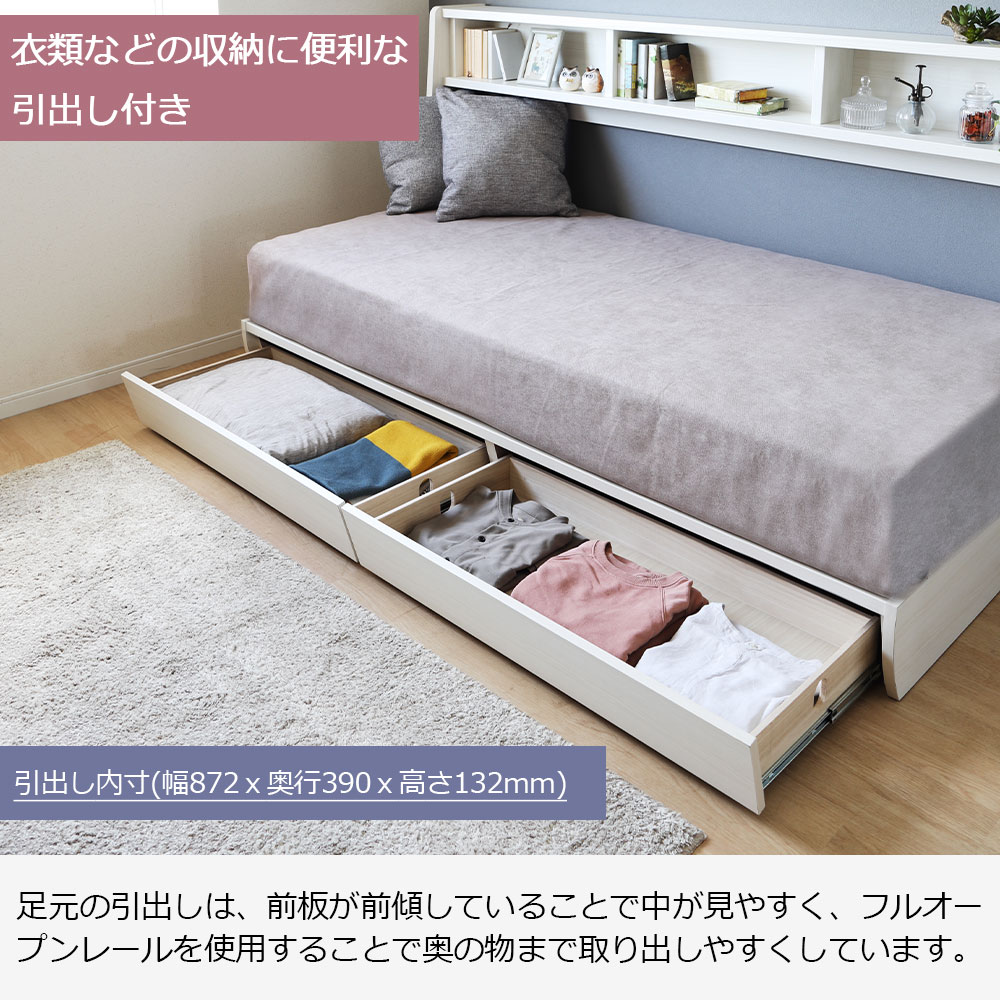 幅97cm、長さが201cmあるのでシングルベッドとしてもソファとしてもお使いいただけます。足元には便利な引出し収納が2杯付いており、一人暮らし用にもおすすめです。