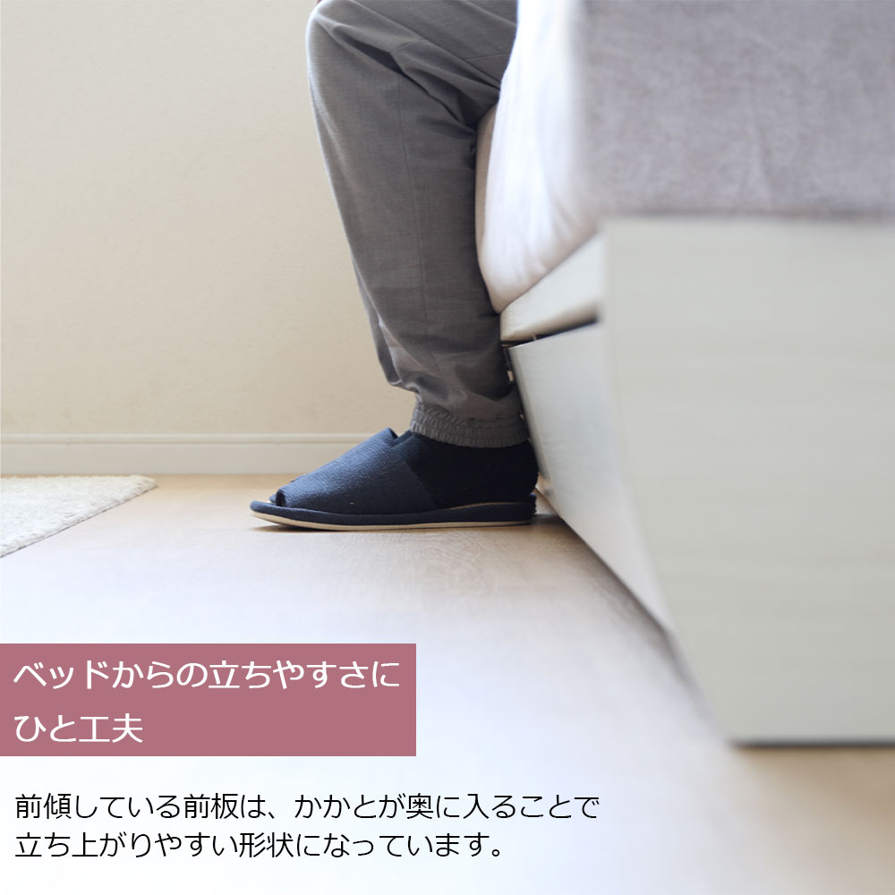 サイド面は書籍や小物が置けるよう幅いっぱいの収納スペースになっています。ベッドに寝そべった姿勢からラクに物を出し入れできます。