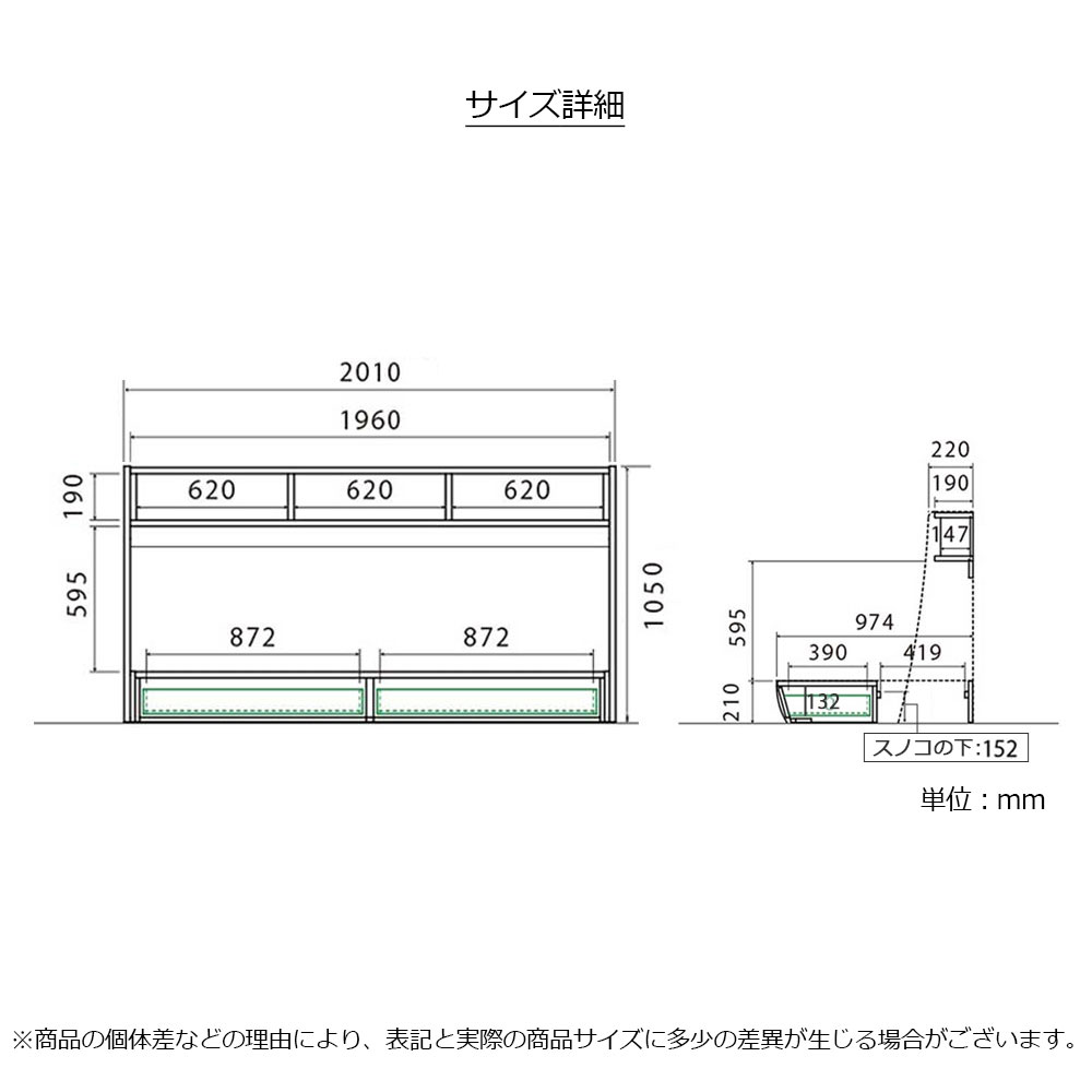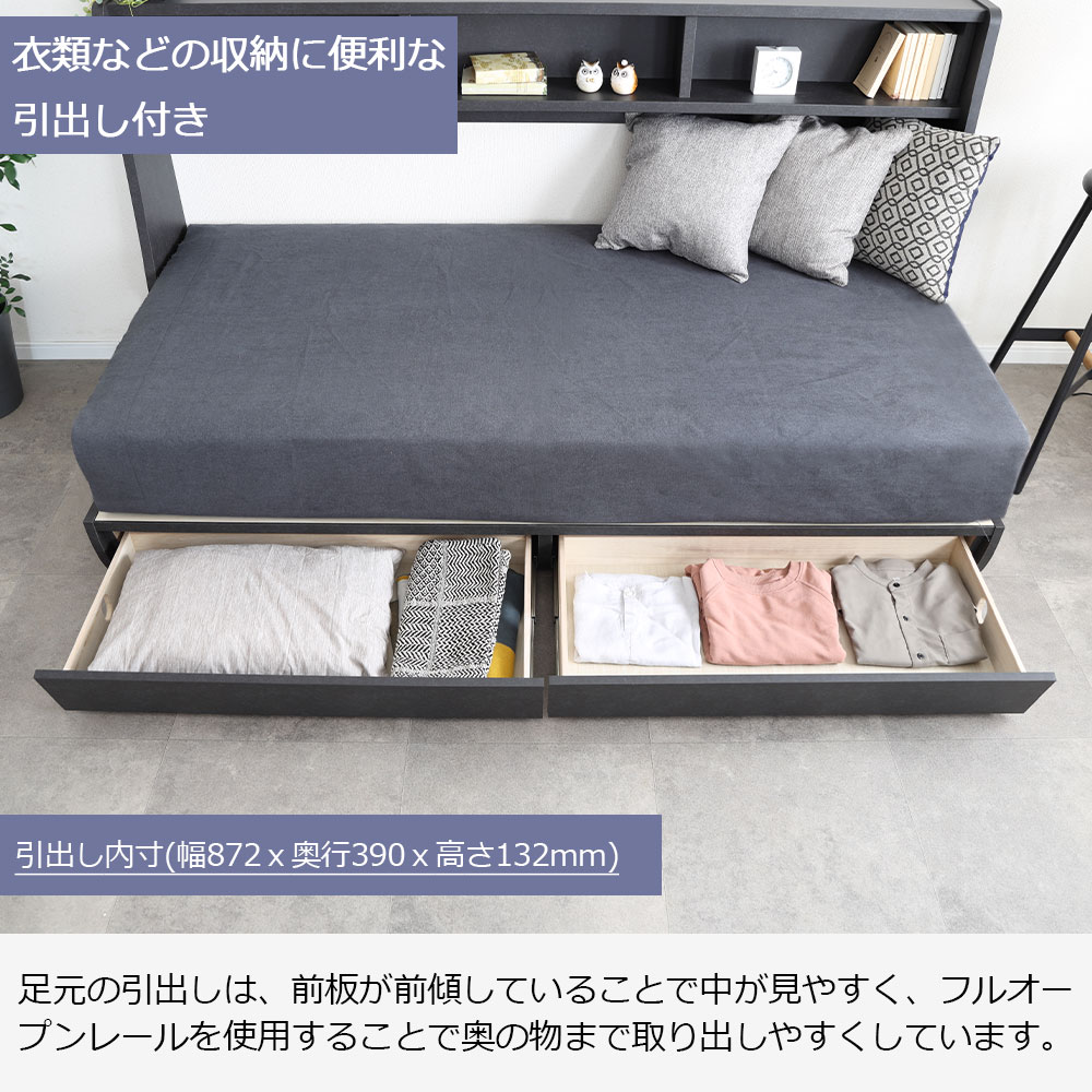 幅97cm、長さが201cmあるのでシングルベッドとしてもソファとしてもお使いいただけます。足元には便利な引出し収納が2杯付いており、一人暮らし用にもおすすめです。