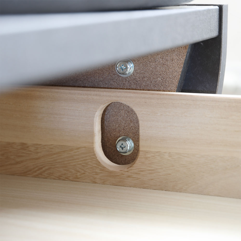 足元の引出しは、前板が前傾していることで中が見やすく、フルオープンレールを使用することで奥の物まで取り出しやすくしています。