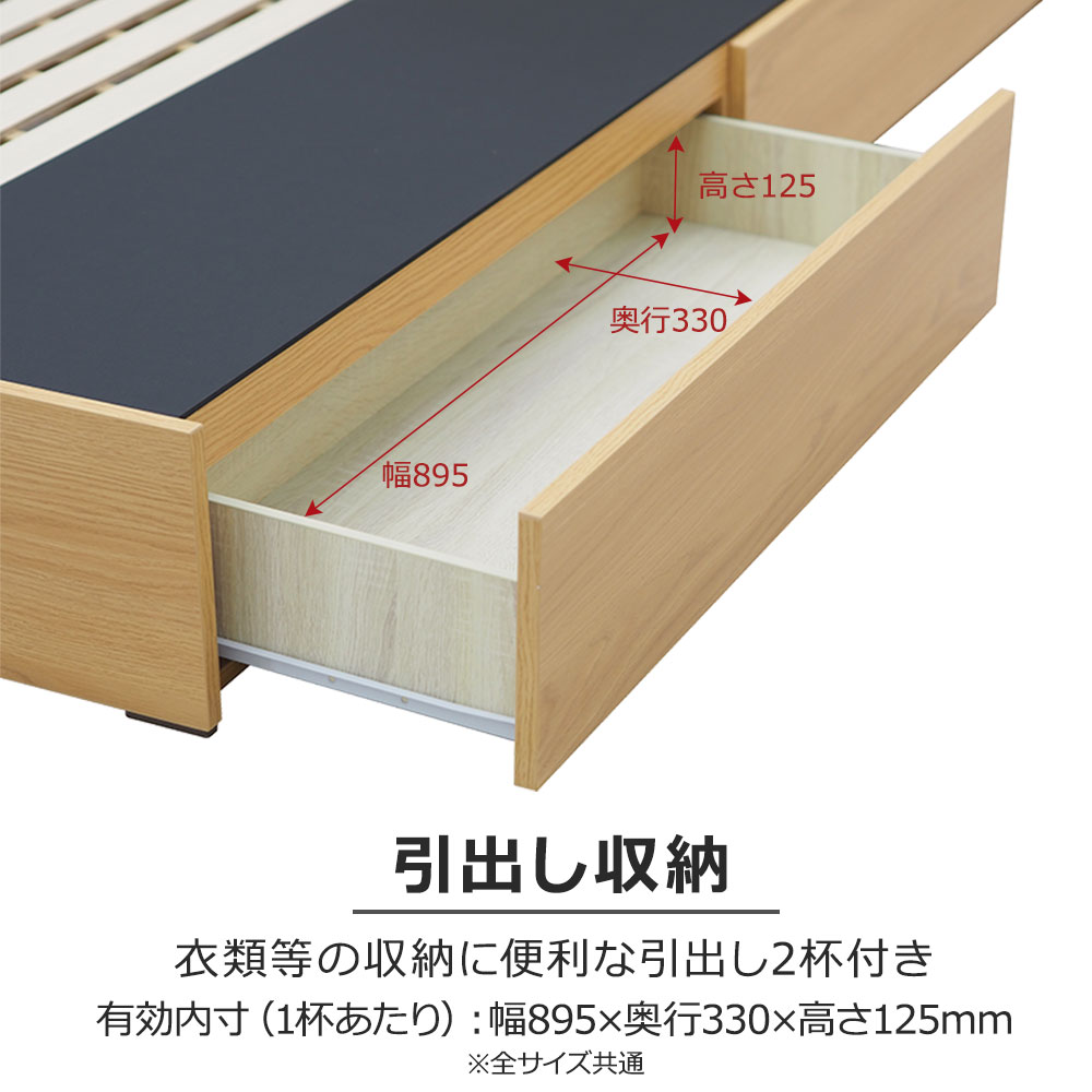 ※画像はシングルサイズ・ウォールナット(WN)色のイメージです。セミダブル、ダブルサイズはすのこ床板部分が広がります。引出しボックスは全サイズ共通です。