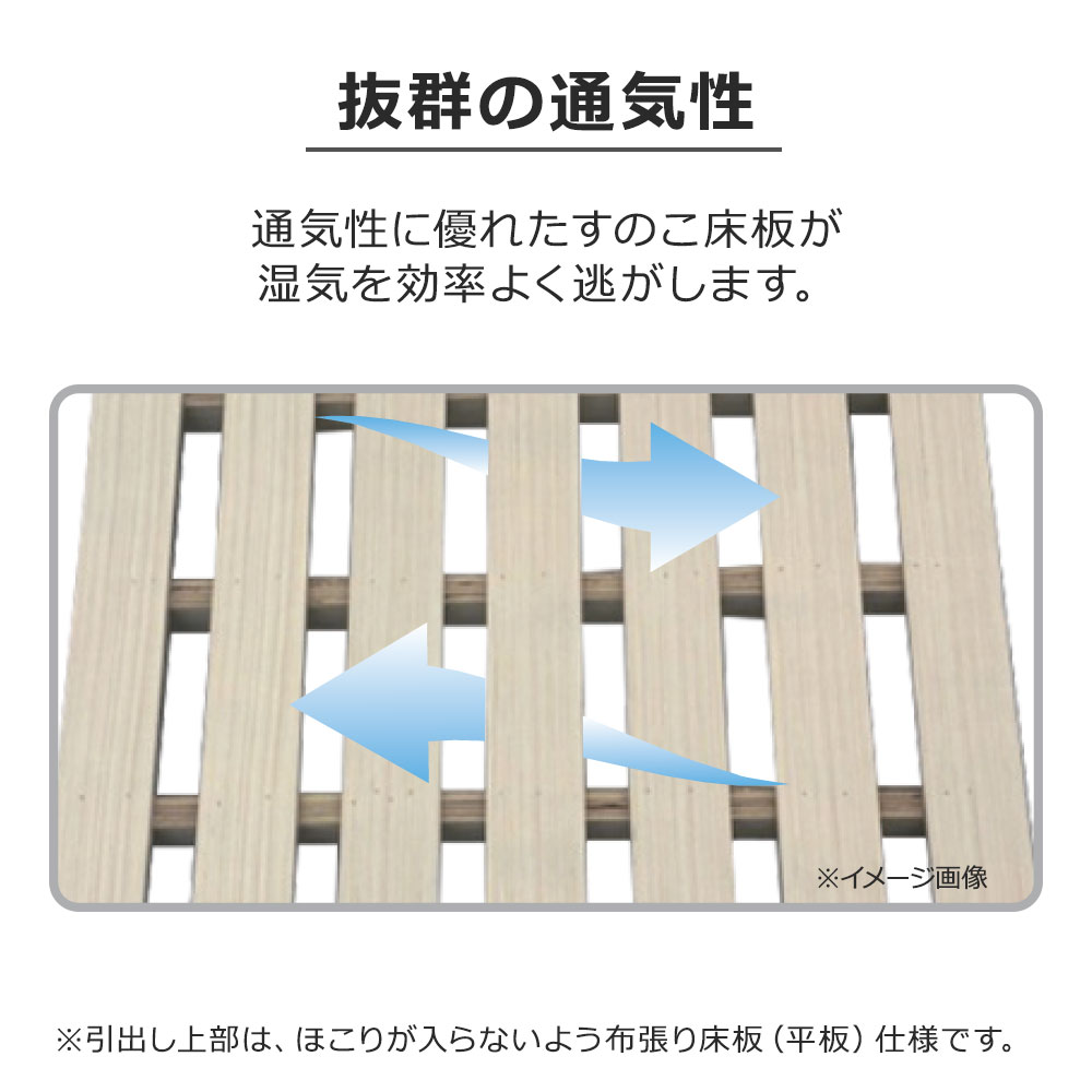 通気性に優れたすのこ床板が湿気を効率よく逃がします。引出し部分はほこりが入らないよう、布張り床板(平板)仕様です。