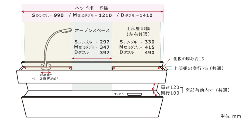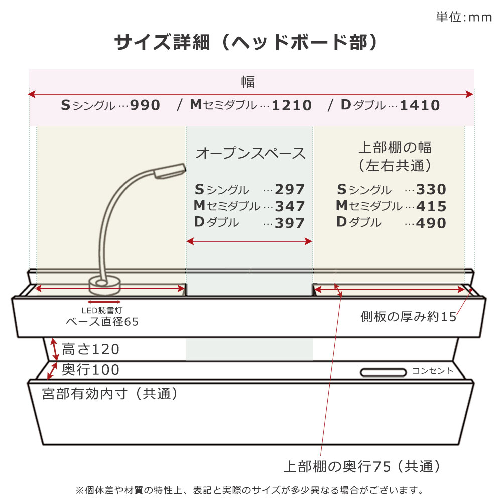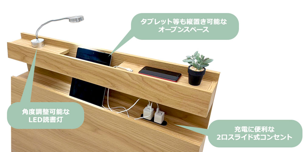 タブレットや雑誌等も縦置き可能なオープンスペースがあり、使い勝手の良いヘッドボードです。角度調整可能なLED読書灯、充電にも便利な2口コンセント付きです。