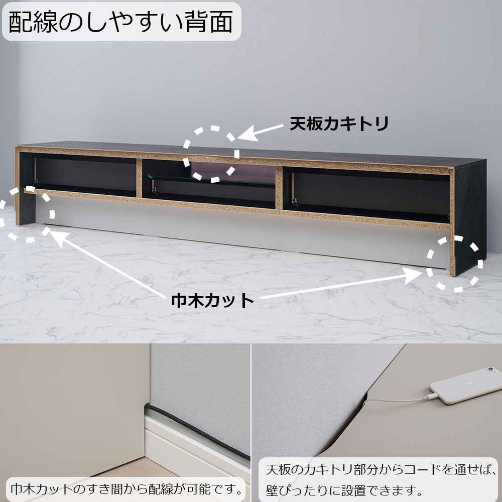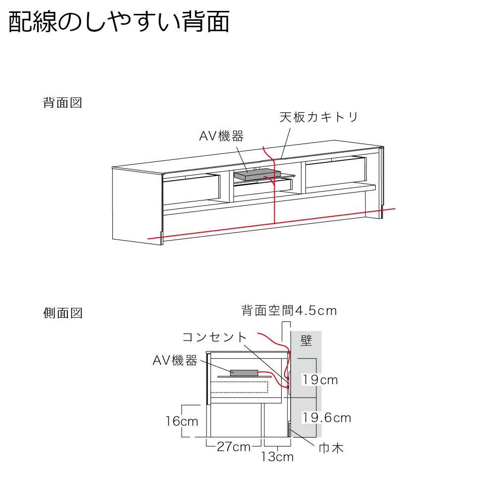 背面は配線のことも考えた設計。巾木カットと天板カキトリが設けられていることで壁にぴったりと設置できます。