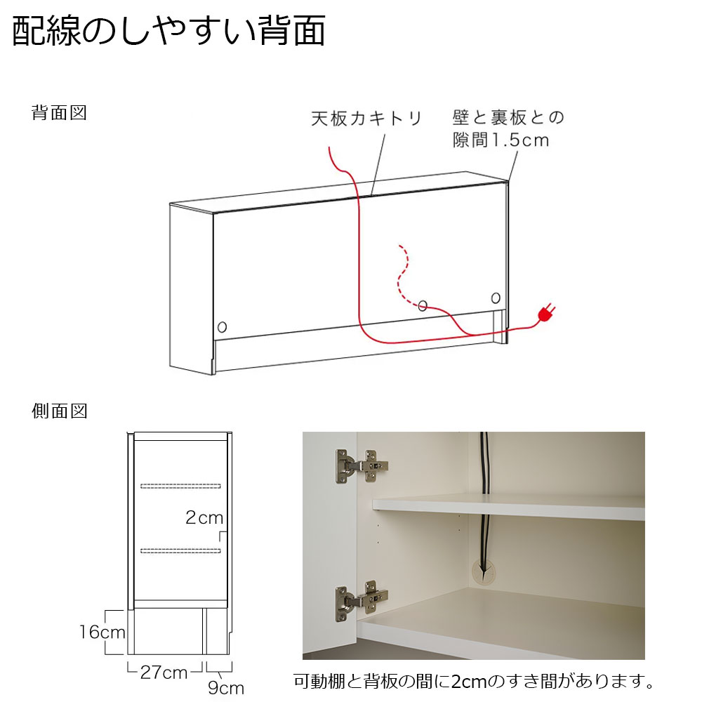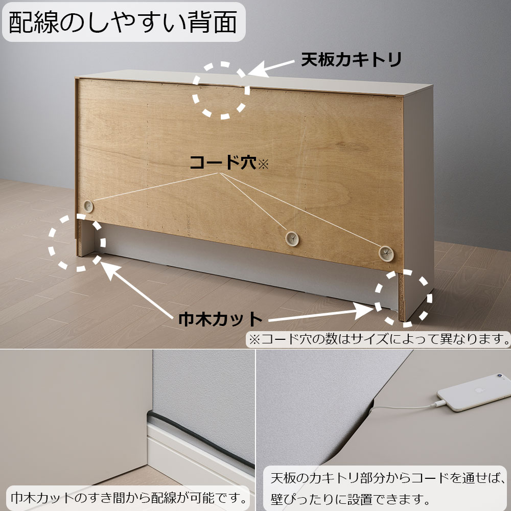 背面は配線のことも考えた設計。巾木カットと天板カキトリが設けられていることで壁にぴったりと設置できます。※画像はLI-150Cのイメージです。