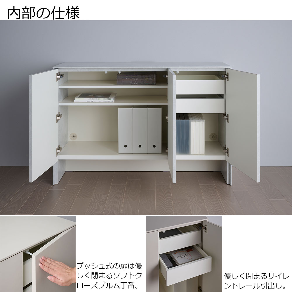 扉は取手のないプッシュ式で、優しく閉まるソフトクローズブルム丁番を採用。内引出しにはサイレントレールを採用しています。