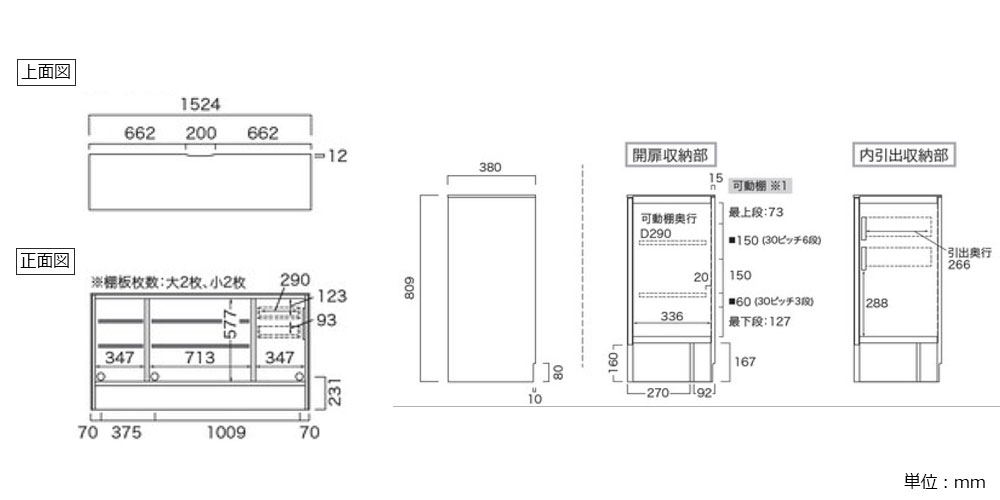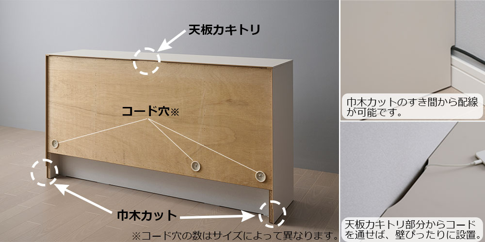 背面は配線のことも考えた設計。巾木カットと天板カキトリが設けられていることで壁にぴったりと設置できます。※画像はLI-150Cのイメージです。