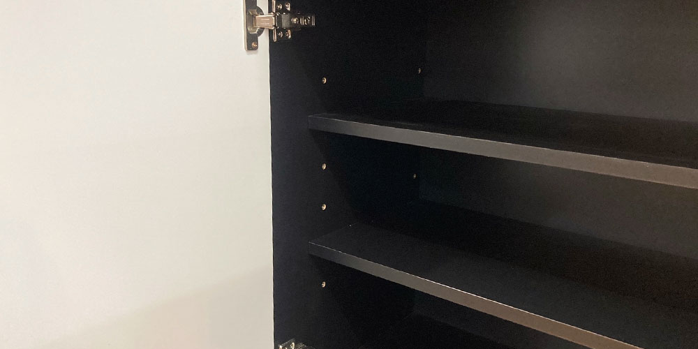 開き扉には安全でゆっくり閉まるダンパー丁番を使用し、静かに開閉します。内部は可動棚2枚付きでたっぷり収納できます。