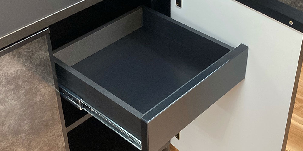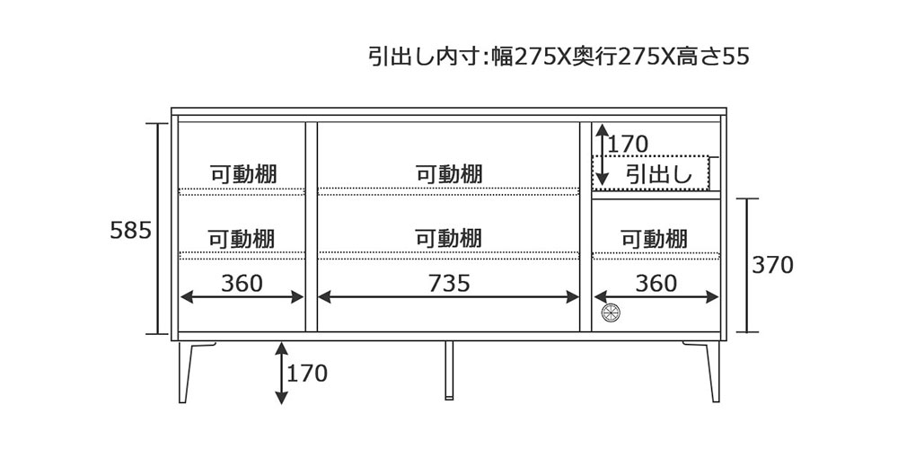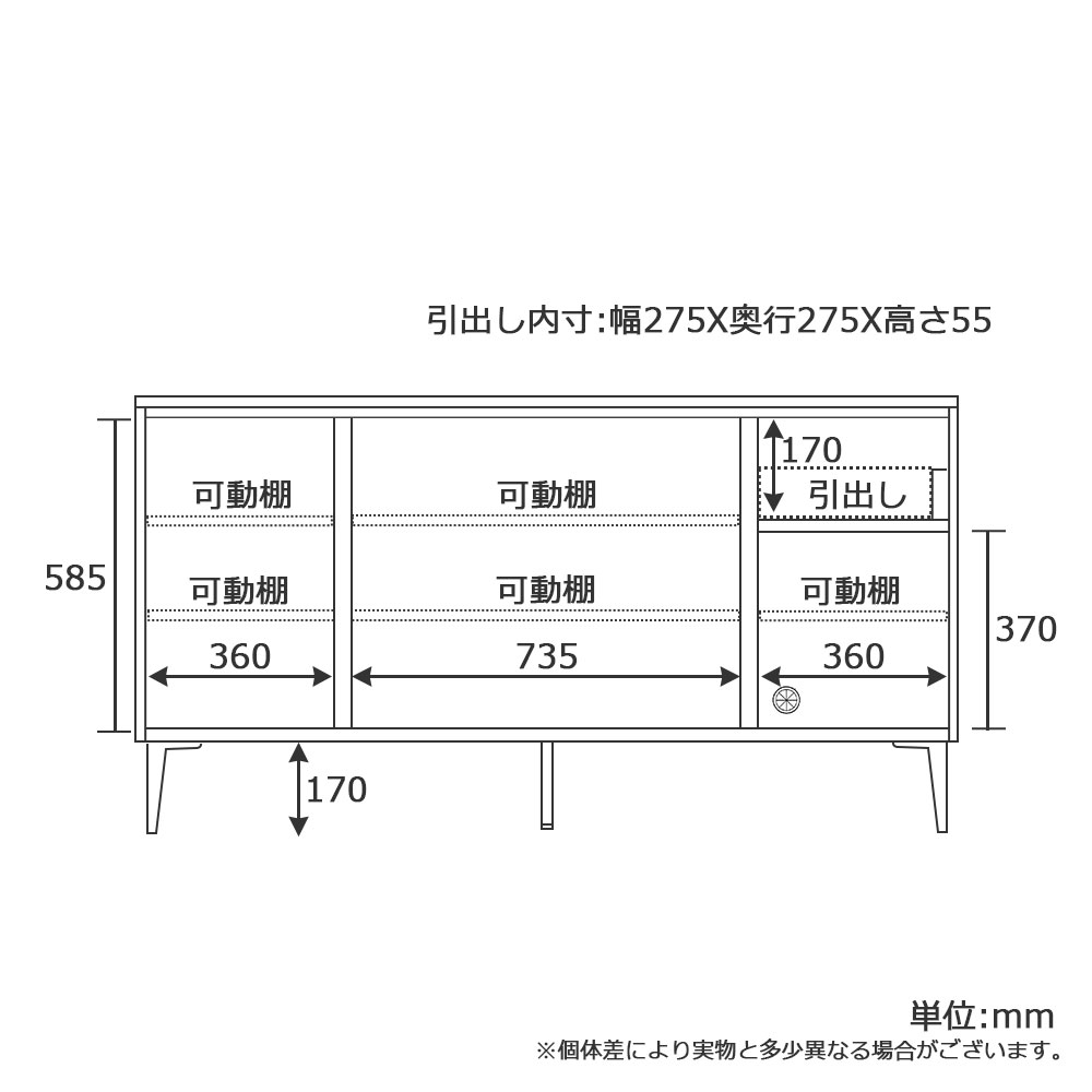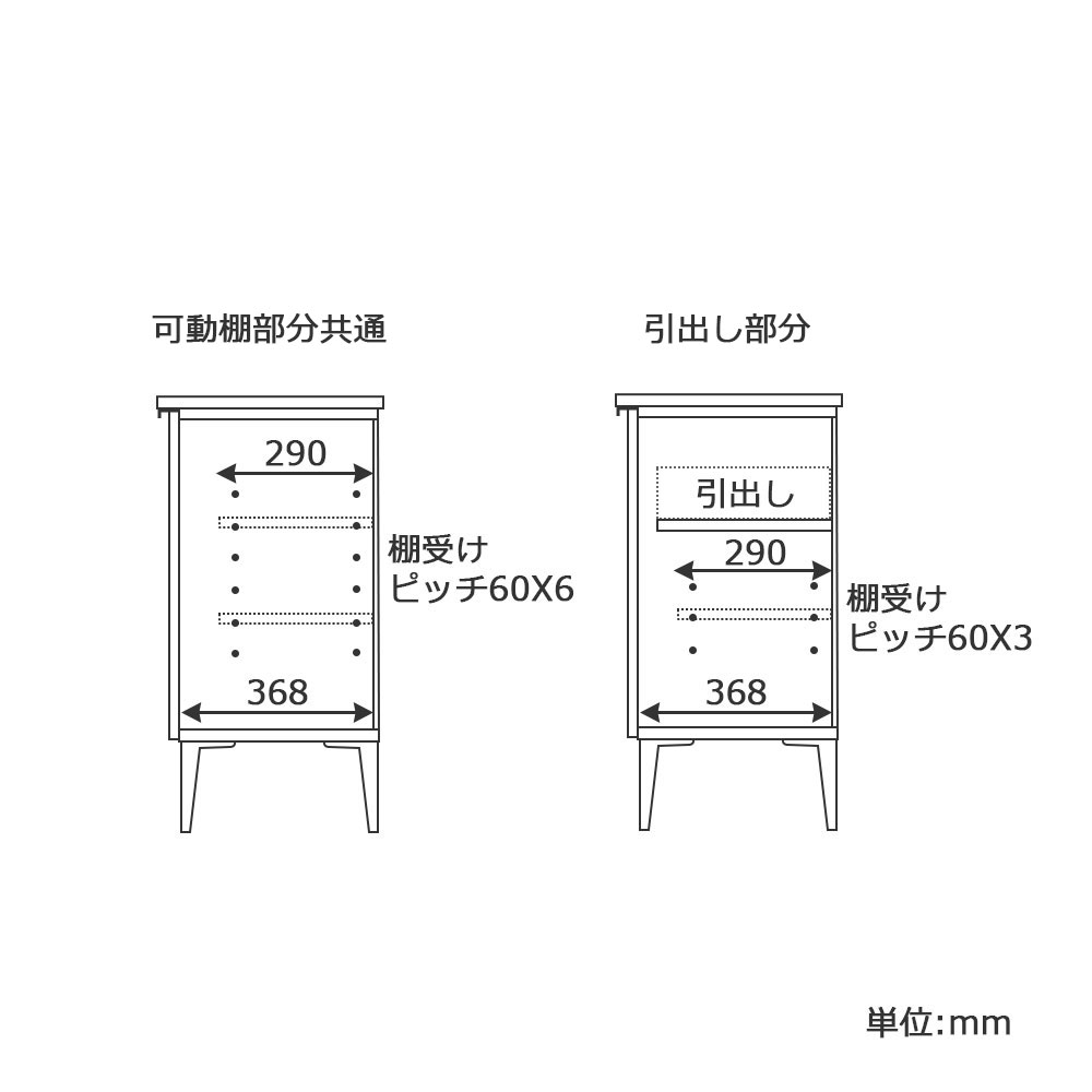 向かって右側の開き扉の中には引出しがついており、細かい物の収納に便利です。