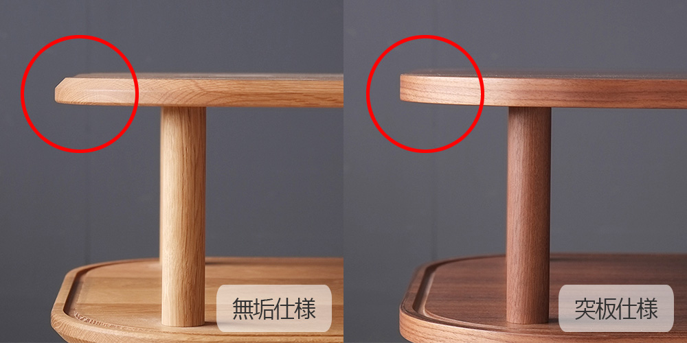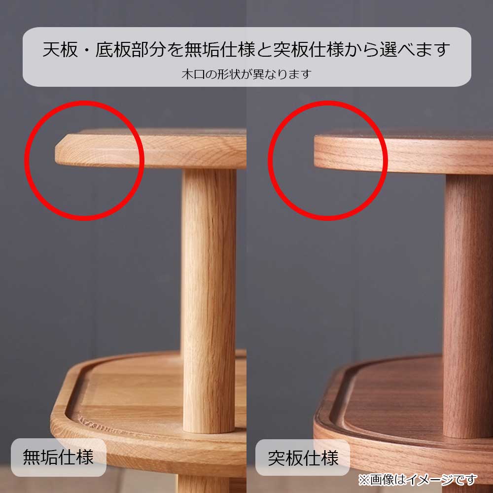 天板・底板部分を突板仕様と無垢仕様から選択ができ、それぞれ木口の形状が異なります。また、塗装もオイル塗装、ウレタン塗装からお選びいただけます。
