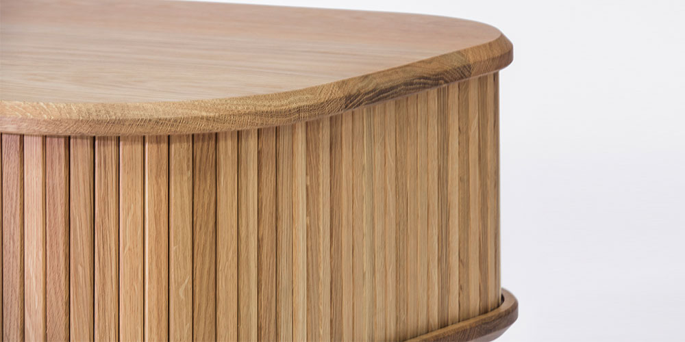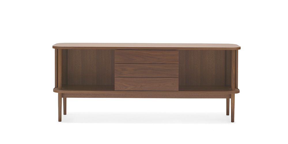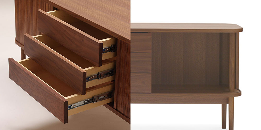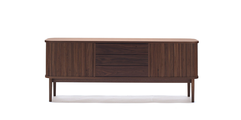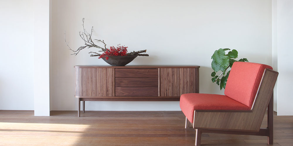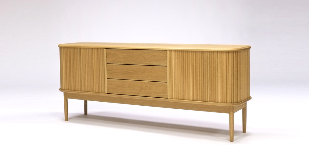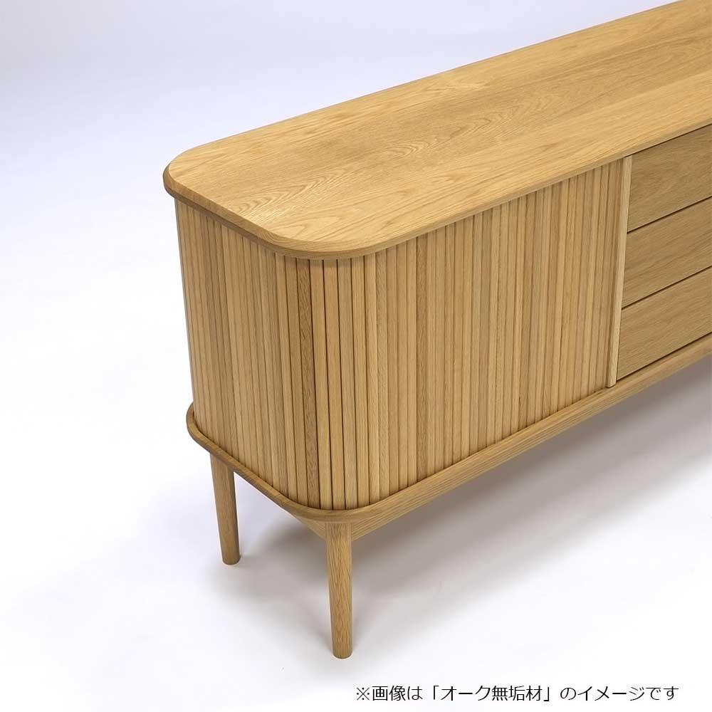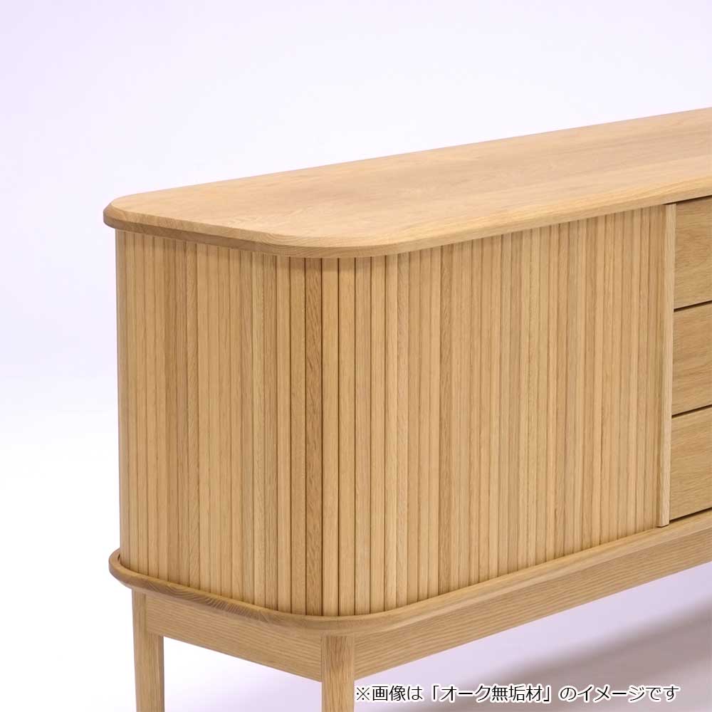 「JYABARA ジャバラ」は無垢の棒材を使用した美しいジャバラ扉が目を惹くサイドボードです。天板、底板に彫られた溝を、ジャバラ扉が滑らかにスライドします。丸みのあるフォルムが上品で柔らかく、落ち着きのある印象を与えます。