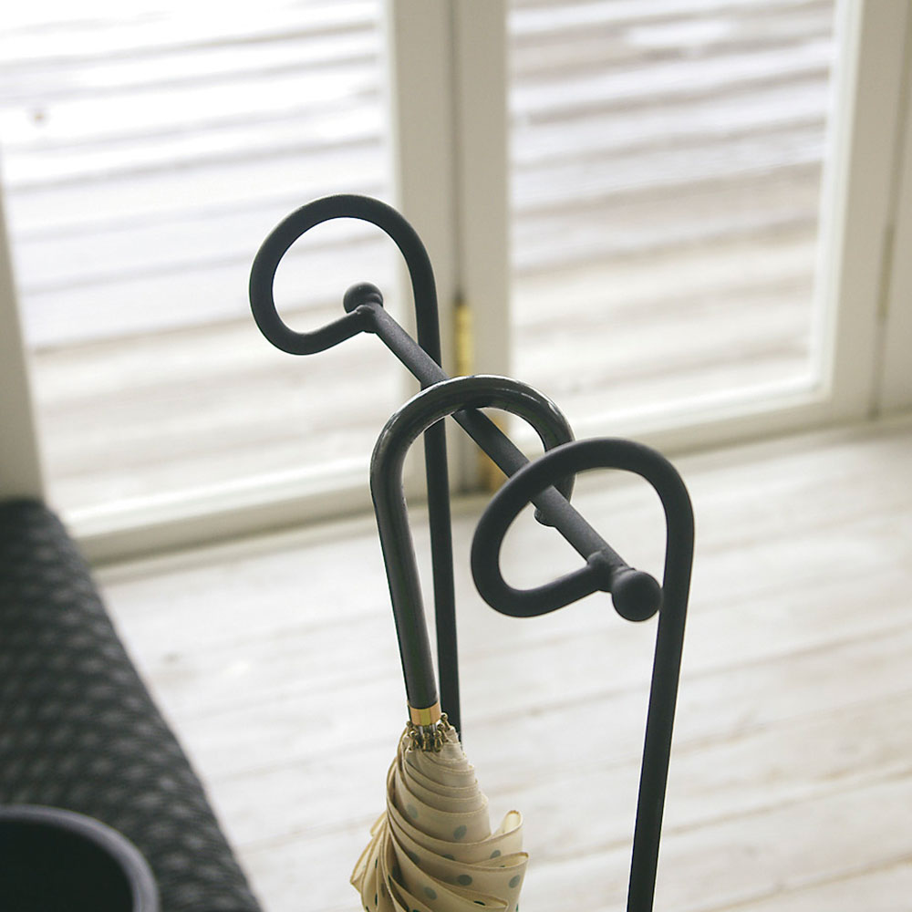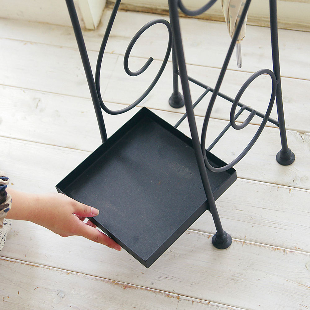 曲線の装飾が印象的なスチールフレームが玄関を彩ります。傘の持ち手を掛けるためのフレーム付きで短い傘も見つけやすいく、快適にお使いいただけます。トレイは横から取り出すことができ、お掃除も簡単です。