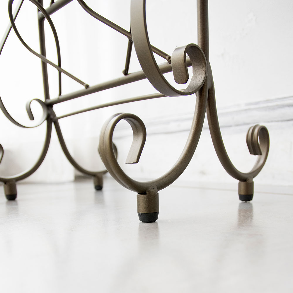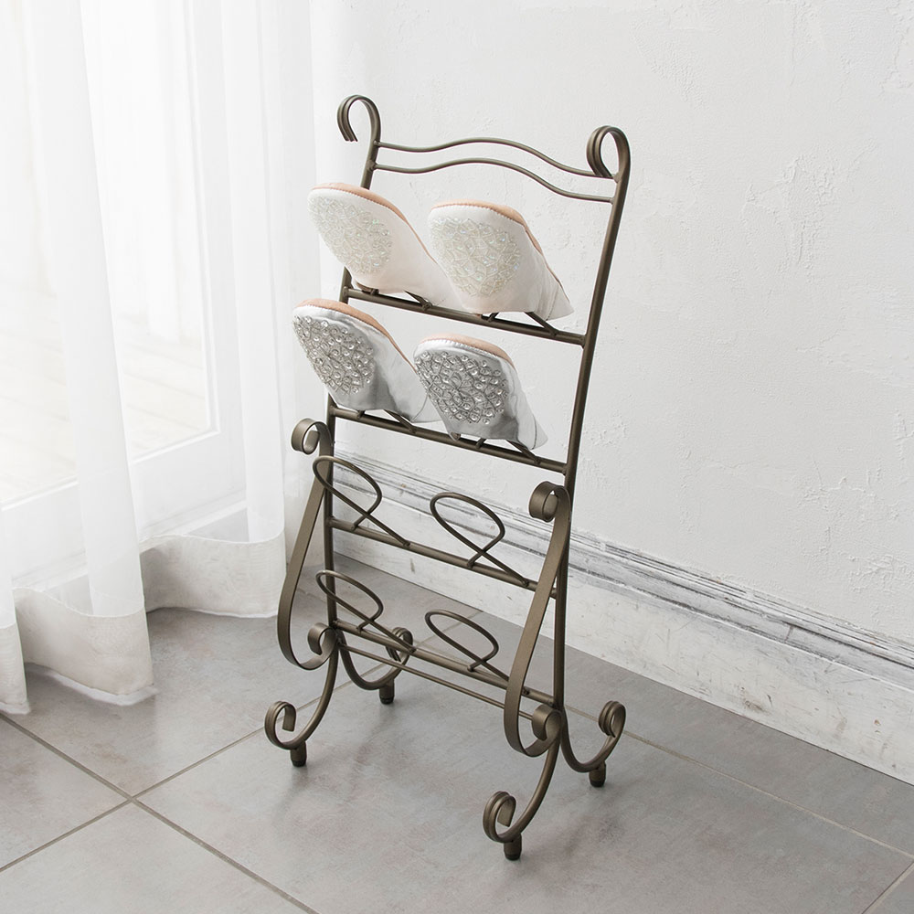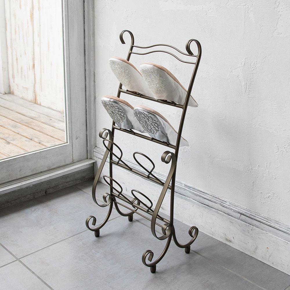 美しい曲線の装飾を施した優美なデザインのスリッパラックです。4足収納でき、お気に入りのスリッパや来客用のスリッパをお洒落に魅せることができます。アンティークゴールドのカラーは高級感のある落ち着いた印象です。