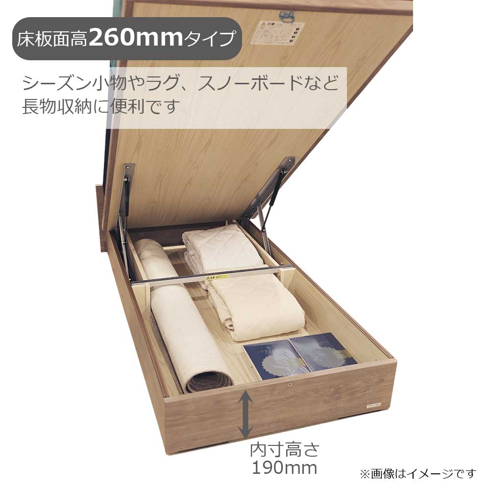 床板面高は3タイプからお選びいただけます。260mmタイプはシーズン小物やラグ、スノーボードなど長物収納に便利です。335mmタイプはゴルフバッグやスーツケースも収納が可能です。450mmタイプは大型スーツケースや羽毛布団をケースのまま収納できます。