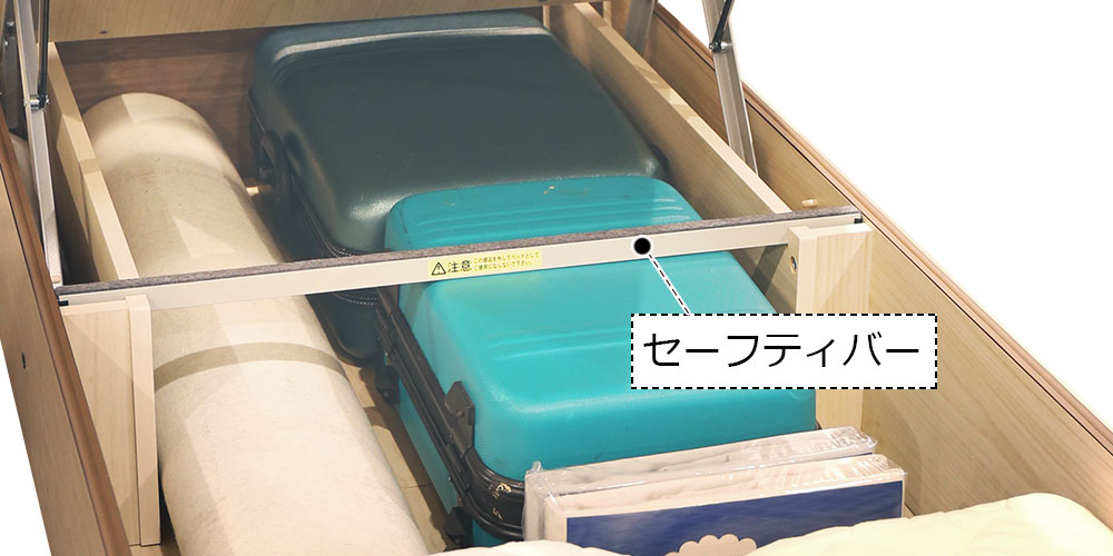 床板のパネルに十分な強度がありますが、より安全にお使いいただけるよう中央にセーフティバーを標準装備しています。簡単に脱着可能ですので邪魔になりません。